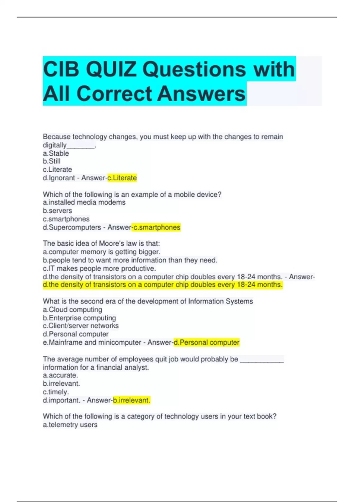 CIB QUIZ Questions with All Correct Answers Because technology changes, you must keep up with the changes to remain digitally_______. a.Stable b.Still c.Literate d.Ignorant - Answer-c.Literate Which of the following is an example of a mobile device? lled media modems rs phones d.Supercomputers - Aphones The basic idea of Moore's law is that: ter memory is getting bigger. e tend to want more information than they need. c.IT makes people more productive. density of transistors on a computer chip doubles every 18-24 months. - A density of transistors on a computer chip doubles every 18-24 months. What is the second era of the development of Information Systems a.Cloud computing b.Enterprise computing c.Client/server networks d.Personal computer e.Mainframe and minicomputer - Answer-d.Personal computer The average number of employees quit job would probably be ___________ information for a financial analyst. ate. evant. y. tant. - Aevant