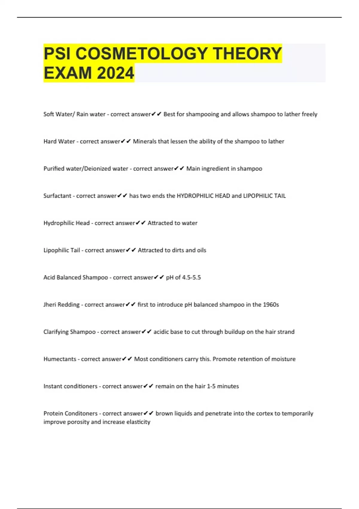 PSI COSMETOLOGY THEORY EXAM 2024 Soft Water/ Rain water - correct answer Best for shampooing and allows shampoo to lather freely Hard Water - correct answer Minerals that lessen the ability of the shampoo to lather Purified water/Deionized water - correct answer Main ingredient in shampoo Surfactant - correct answer has two ends the HYDROPHILIC HEAD and LIPOPHILIC TAIL Hydrophilic Head - correct answer Attracted to water Lipophilic Tail - correct answer Attracted to dirts and oils Acid Balanced Shampoo - correct answer pH of 4.5-5.5 Jheri Redding - correct answer first to introduce pH balanced shampoo in the 1960s Clarifying Shampoo - correct answer acidic base to cut through buildup on the hair strand Humect