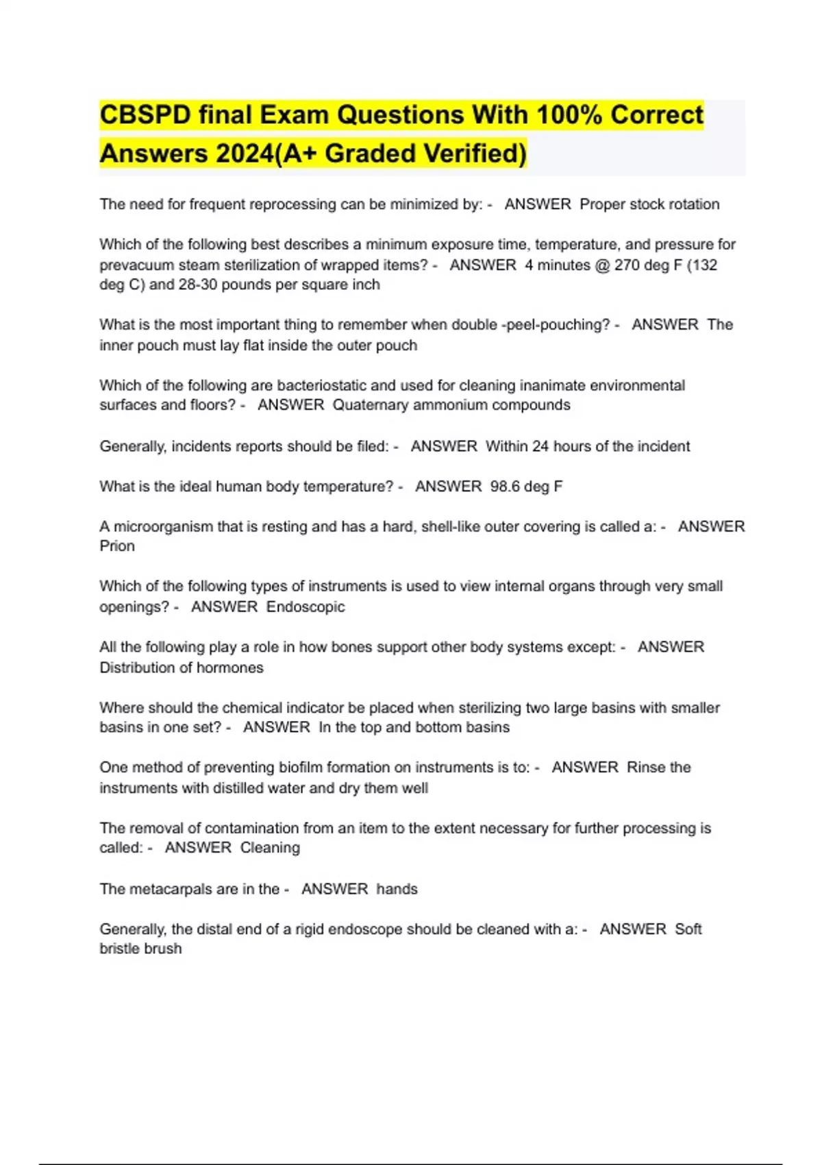 The need for frequent reprocessing can be minimized by: - ANSWER Proper stock rotation Which of the following best describes a minimum exposure time, temperature, and pressure for prevacuum steam sterilization of wrapped items? - ANSWER 4 minutes @ 270 deg F (132 deg C) and 28-30 pounds per square inch What is the most important thing to remember when double -peel-pouching? - ANSWER The inner pouch must lay flat inside the outer pouch