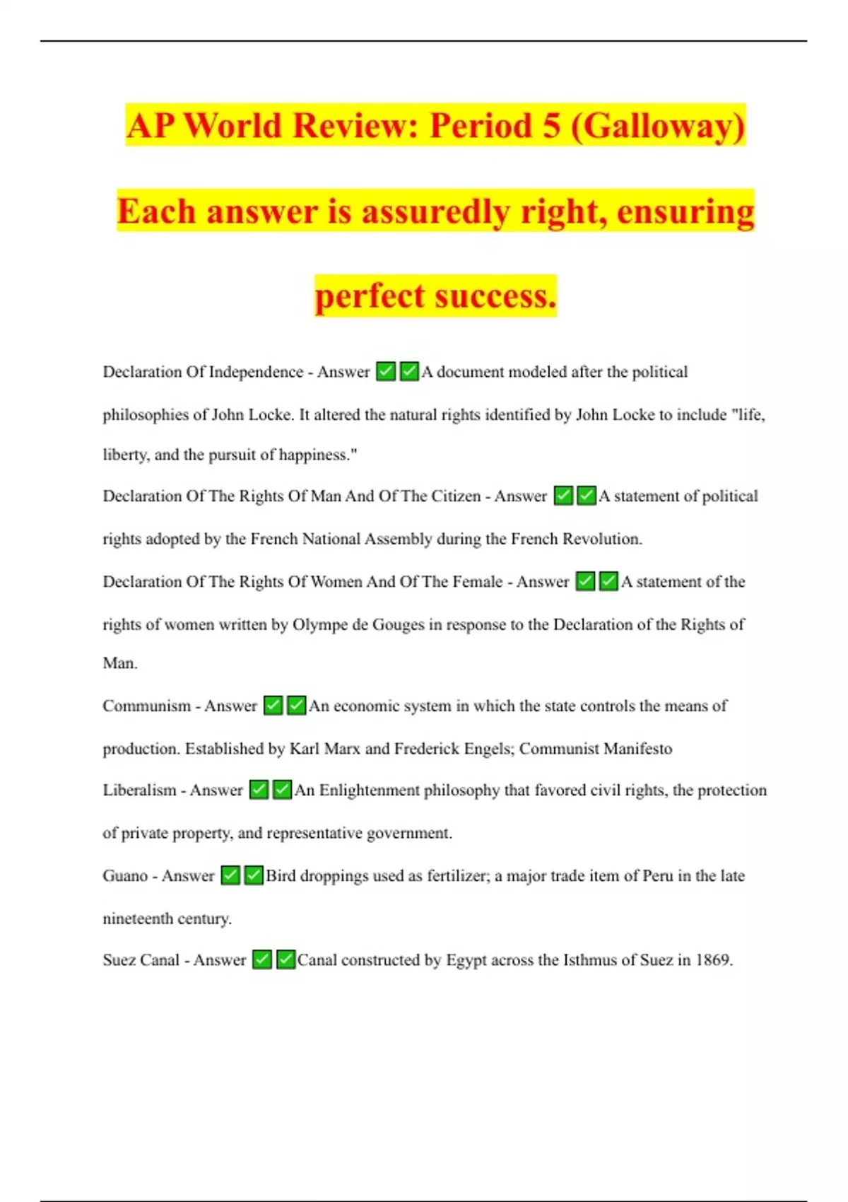 AP World Review: Period 5 (Galloway) Each answer is assuredly right, ensuring perfect success.