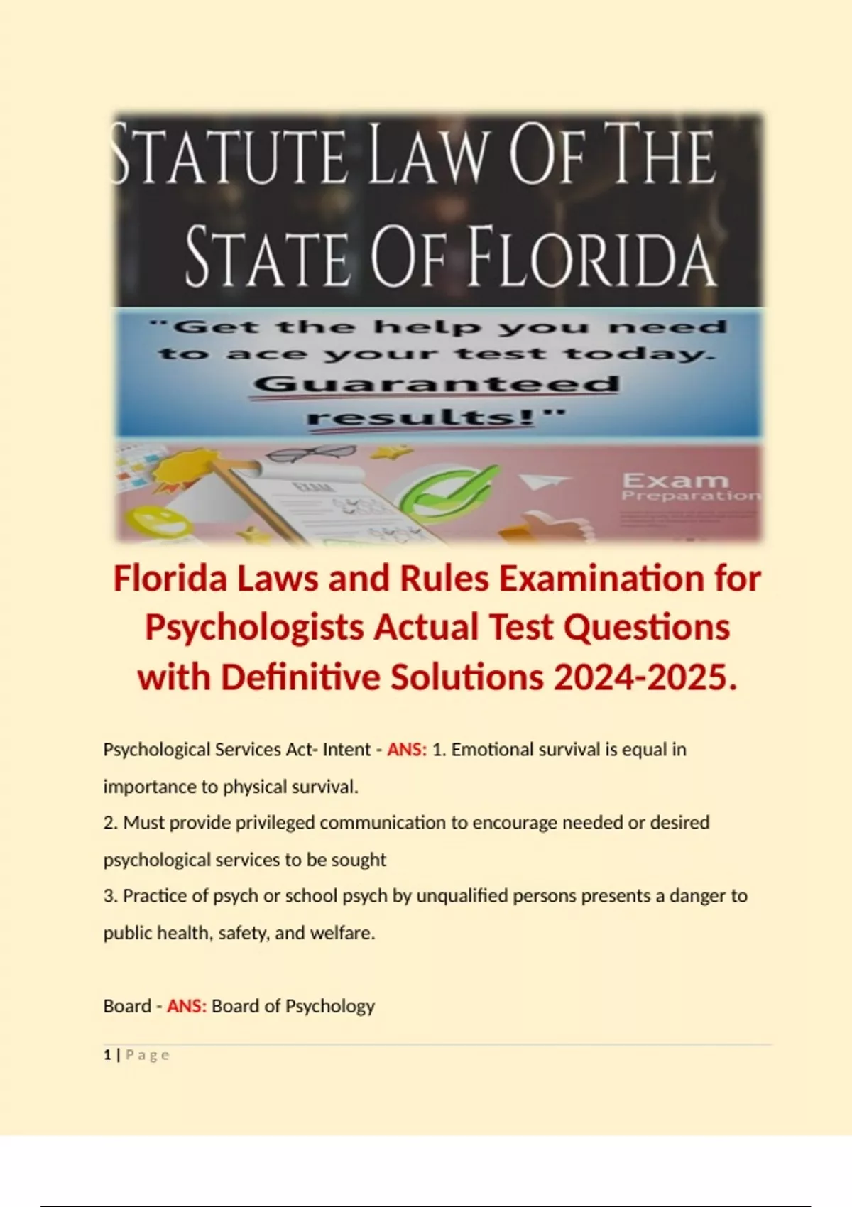 Florida Laws and Rules Examination for Psychologists Actual Test Questions with Definitive Solutions .