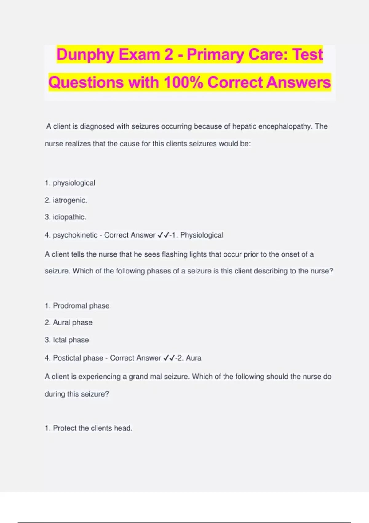 Dunphy Exam 2 - Primary Care: Test Questions with 100% Correct Answers A client is diagnosed with seizures occurring because of hepatic encephalopathy. The nurse realizes that the cause for this clients seizures would be: 1. physiological 2. iatrogenic. 3. idiopathic. 4. psychokinetic - Correct Answer ️️ -1. Physiological A client tells the nurse that he sees flashing lights that occur prior to the onset of a seizure. Which of the following phases of a seizure is this client describing to the nurse? 1. Prodromal phase 2. Aural phase 3. Ictal phase 4. Postictal phase - Correct Answer ️️ -2. Aura A client is experiencing a grand mal seizure. Which of the following should the nurse do during this seizure? 1. Protect the clients head. 2. Leave the client alone. 3. Give water to the client to avoid dehydration. 4. Place a finger in the clients mouth to avoid swallowing the tongue. - Correct Answer ️️ -1. Protect the clients head A client is prescribed phenytoin (Dilantin) for a seizure disorder. Which of the following would indicate that the client is adhering to the medication schedule? 1. The client is sleepy. 2. The client is not experiencing seizures. 3. The client no longer has headaches. 4. The client is eating more food - Correct Answer ️️ -2. The client is not experiencing seizures. The nurse is unable to insert an intravenous access line into a client who is currently experiencing a seizure. Which of the following routes can the nurse use to provide medication to the client at this time? 1. Oral 2. Intranasal 3. Rectal 4. Intramuscular - Correct Answer ️️ -2. intranasal One of the most important things a nurse can teach a client about seizure control is to: 1. take the medication every day as prescribed by the doctor. 2. eat a balanced diet. 3. get lots of exercise. 4. take naps during the day - Correct Answer ️️ -1. take the medication every day as prescribed by the doctor For the client who is at risk for stroke, the most important guideline the nurse should teach is to: 1. increase drinks with caffeine. 2. monitor blood pressure. 3. increase amounts of sodium in the diet. 4. monitor weight and activity. - Correct Answer ️️ -2. monitor blood pressure. The family of a client diagnosed with a stroke asks the nurse if this health problem is very common. The nurse should respond that in the United States a person has a stroke every: 1. 40 seconds. 2. 1 minutes. 3. 2 minutes. 4. 5 minutes. - Correct Answer ️️ -1. 40 seconds. A client is being evaluated for a stroke. The nurse knows that one of the easiest and most common diagnostic tests used to differentiate between strokes is: 1. computed tomography (CT). 2. magnetic resonance imaging (MRI). 3. electrocardiography (EEG). 4. positron emission tomography (PET). - Correct Answer ️️ -1. computed tomography (CT). While instructing a client on stroke prevention, the nurse mentions medications that are useful in stroke prevention. The following medications are effective in preventing a stroke, EXCEPT: 1. anticoagulants. 2. antiplatelets. 3. anticholinergics. 4. neuroprotective agents. - Correct Answer ️️ -3. anticholinergics. A client is being seen in the emergency department experiencing symptoms of a stroke. The nurse realizes that the administration of a medication to break clots, such as tPA, should be administered within how many minutes of the client presenting to the emergency department? 1. 30 minutes 2. 60 minutes 3. 90 minutes 4. 120 minutes - Correct Answer ️️ - A client diagnosed with an embolic stroke is not a candidate for tPA. The nurse realizes that the client might be eligible for which of the following forms of trea