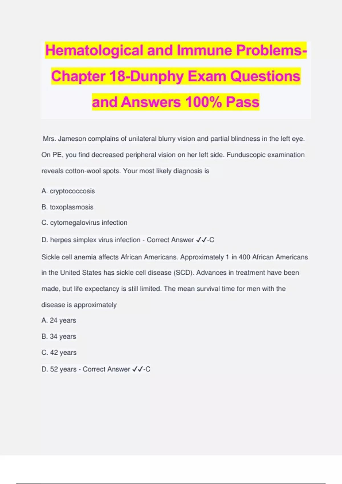 Hematological and Immune Problems- Chapter 18-Dunphy Exam Questions and Answers 100% Pass Mrs. Jameson complains of unilateral blurry vision and partial blindness in the left eye. On PE, you find decreased peripheral vision on her left side. Funduscopic examination reveals cotton-wool spots. Your most likely diagnosis is A. cryptococcosis B. toxoplasmosis C. cytomegalovirus infection D. herpes simplex virus infection - Correct Answer ️️ -C Sickle cell anemia affects African Americans. Approximately 1 in 400 African Americans in the United States has sickle cell disease (SCD). Advances in treatment have been made, but life expectancy is still limited. The mean survival time for men with the disease is approximately A. 24 years B. 34 years C. 42 years D. 52 years - Correct Answer ️️ -C You suspect that your new client Doug, age 28, has hepatitis C although he is currently asymptomatic. Your suspicion is based on his medical history, which includes which of the following factors that has been identified as a red flag for this disease? A. History of GERD B. Diet high in fat and alcohol C. A history of mononucleosis at age 17 D. Unsafe sexual behaviors - Correct Answer ️️ -D Your client, George, age 60, presents with pruritus and complains of lymphadenopathy in his neck. He also complains of night sweats and has noticed a low-grade fever. He has not lost any weight and otherwise feels well. He is widowed and has been dating a new woman recently. On physical examination, you find enlarged supraclavicular nodes. You suspect: A. Lung cancer. B. Hodgkin's lymphoma. C. A lingering viral infection from a bout of flu he had 6 weeks ago. D. Non-Hodgkin's lymphoma. - Correct Answer ️️ -B Mindy, age 6, recently was discharged from the hospital after a sickle cell crisis. You are teaching her parents to be alert to the manifestations of splenic sequestration and tell them to be alert to A. vomiting and diarrhea B. decreased mental acuity C. abdominal pain, pallor, and tachycardia D. abdominal pain and vomiting - Correct Answer ️️ -C Your client Mrs. Young, age 64, is here to see you because she has pain in her left breast. She reports no pain in her right breast and no noted lesions or masses on breast self-exam, which she performs monthly. You know that A. at her age, you do not need to worry about breast cancer B. initial presentation of breast pain is usually not suspicious for a malignancy C. she must be sent for a mammogram as soon as possible D. she has no personal or family history of breast cancer; therefore, you are not concerned - Correct Answer ️️ -C Samantha is being given platelets because of acute leukemia. One "pack" of platelets should raise her count by how much? A. 2,000 to 4,000 mm3 B. 5,000 to 8,000 mm3 C. 9,000 to 12,000 mm3 D. About 15,000 mm3 - Correct Answer ️️ -B Sherri's blood work returns with a decreased mean cell volume (MCV) and a decreased mean cellular hemoglobin concentration (MCHC). What should you do next? A. Order a serum iron and total iron binding capacity (TIBC) B. Order a serum ferritin C. Order a serum folate level D. Order a serum iron, TIBC, and serum ferritin level - Correct Answer ️️ -D Robin has HIV and is having a problem with massive diarrhea. You suspect the cause is A. cryptococcosis B. toxoplasmosis C. cryptosporidiosis D. cytomegalovirus - Correct Answer ️️ -C Julia asks how smoking increases the risk for folic acid deficiency. You respond that smoking A. causes small-vessel disease and constricts all vessels that transport essential nutrients B. decreases vitamin C absorption C. affects the liver's ability to store folic acid D. causes nausea, thereby inhibiting the appetite and ingestion of foods rich in folic ac