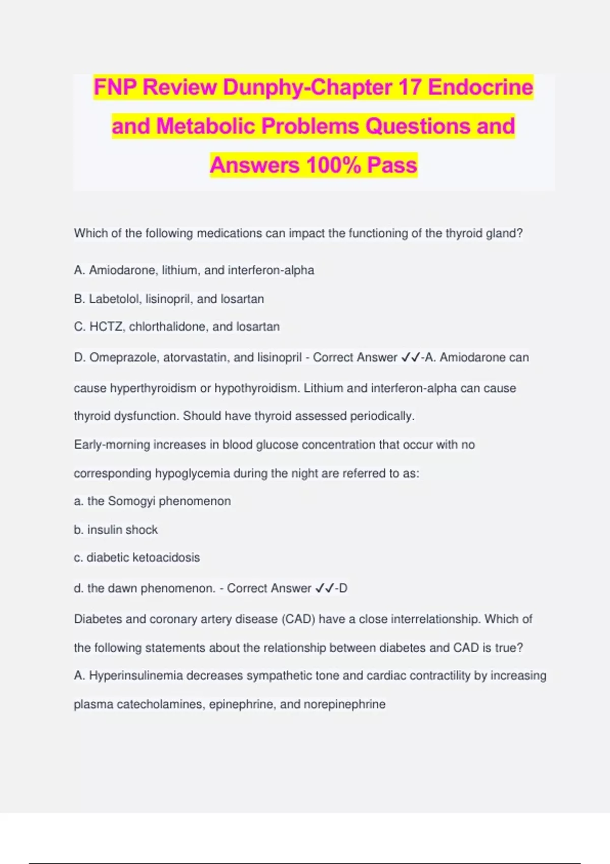 FNP Review Dunphy-Chapter 17 Endocrine and Metabolic Problems Questions and Answers 100% Pass Which of the following medications can impact the functioning of the thyroid gland? A. Amiodarone, lithium, and interferon-alpha B. Labetolol, lisinopril, and losartan C. HCTZ, chlorthalidone, and losartan D. Omeprazole, atorvastatin, and lisinopril - Correct Answer ️️ -A. Amiodarone can cause hyperthyroidism or hypothyroidism. Lithium and interferon-alpha can cause thyroid dysfunction. Should have thyroid assessed periodically. Early-morning increases in blood glucose concentration that occur with no corresponding hypoglycemia during the night are referred to as: a. the Somogyi phenomenon b. insulin shock c. diabetic ketoacidosis d. the dawn phenomenon. - Correct Answer ️️ -D Diabetes and coronary artery disease (CAD) have a close interrelationship. Which of the following statements about the relationship between diabetes and CAD is true? A. Hyperinsulinemia decreases sympathetic tone and cardiac contractility by increasing plasma catecholamines, epinephrine, and norepinephrine B. An increase of glucose causes the distal nephrons of the kidneys to absorb less sodium, resulting in more fluid, expanding the intravascular volume, and increasing the blood pressure C. Hyperinsulinemia causes a large number of vascular smooth muscle cells to be formed and deposited on the walls of vessels, eventually decreasing space for blood flow D. An increase in glucose stimulates more secretion of epinephrine, thus raising the blood pressure - Correct Answer ️️ -C Hyperinsulinemia causes a large number of vascular smooth muscle cells to be formed and deposited on the walls of vessels, causing buildup and eventual blockage, reducing blood flow; hyperinsulinemia increases (not decreases) sympathetic tone and cardiac contractility by increasing plasma catecholamine, epinephrine, and norepinephrine levels; and an increase in the glucose level causes the distal nephrons of the kidneys to absorb more (not less) sodium, resulting in more fluid, expanding the intravascular volume and increasing blood pressure What is the medication of choice for an initial acute attack of gout? A. An NSAID B. Colchicine C. A corticosteroid D. Allopurinol (Zyloprim) - Correct Answer ️️ -A Indomethacin (Indocin) is more commonly prescribed. An initial dose of 50-75mg is given, followed by 25-50mg every 8 hours for 5-10 days. Naproxen is 750 mg, followed by 250 mg every 8 hours for 5-10 days. Marsha, age 24, is preparing for radioactive iodine therapy for her Graves' disease. Which test must she undergo first? A. Beta human chorionic gonadotropin B. Basal metabolism rate C. Lithium level D. Serum calcium - Correct Answer ️️ -A Contraindicated during pregnancy When teaching Marcy how to use her new insulin pump, you tell her that she needs to monitor her blood glucose level A. at least once a day B. only occasionally because glycemic levels are maintained very steadily C. at least four times a day D. on an as-needed basis when she feels she needs to give herself an extra dose of insulin - Correct Answer ️️ -C Joan has severe asthma and has been on high doses of oral corticosteroids for 2 years. She has been reading some home remedy books and stops all of her medications. What condition may she develop? a. myxedema crisis b. diabetes insipidus c. hypoparathyroidism d. addisonian crisis - Correct Answer ️️ -D If a client has hepatitis, abdominal pain in the right upper quadrant is a result of what patho-physiological basis? A. Reduced prothrombin synthesis by injured hepatic cells B. Bile salt accumulation C. Release of pyrogens D. Stretching of Glisson's capsule - Correct Answer ️️ -D How long after the acute illness of hepatitis A do immunoglobulin M anti-hepatitis A virus titers disappear? A. 1 week B. 3 to 6 months C. 1 year D. 2 years - Correct Answer ️️ -B Which of the following individuals would not be a candidate for a thiaz