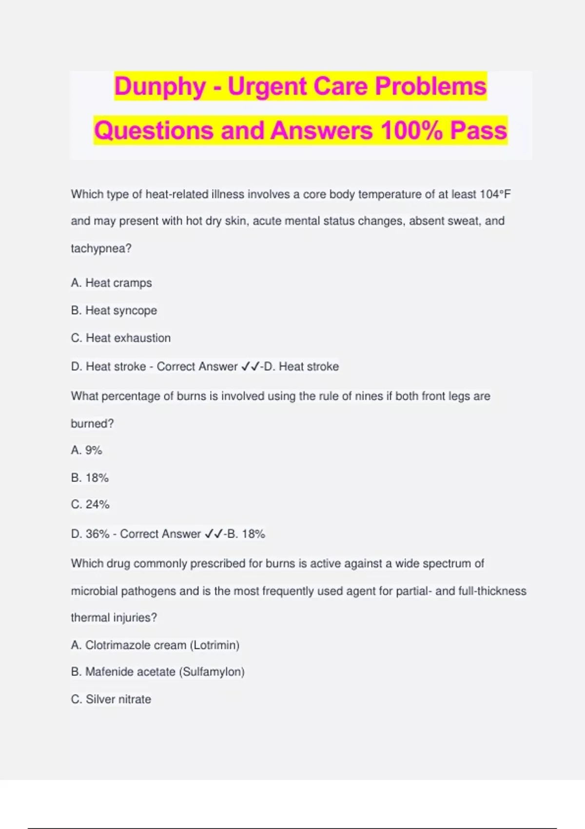 Dunphy - Urgent Care Problems Questions and Answers 100% Pass Which type of heat-related illness involves a core body temperature of at least 104°F and may present with hot dry skin, acute mental status changes, absent sweat, and tachypnea? A. Heat cramps B. Heat syncope C. Heat exhaustion D. Heat stroke - Correct Answer ️️ -D. Heat stroke What percentage of burns is involved using the rule of nines if both front legs are burned? A. 9% B. 18% C. 24% D. 36% - Correct Answer ️️ -B. 18% Which drug commonly prescribed for burns is active against a wide spectrum of microbial pathogens and is the most frequently used agent for partial- and full-thickness thermal injuries? A. Clotrimazole cream (Lotrimin) B. Mafenide acetate (Sulfamylon) C. Silver nitrate D. Silver sulfadiazine (Silvadene) - Correct Answer ️️ -D. Silver sulfadiazine (Silvadene) A sunscreen with a sun-protection factor of at least what number will block most harmful ultraviolet radiation? A. 4 B. 8 C. 10 D. 15 - Correct Answer ️️ -D. 15 Which clinical feature is a late sign of increased intracranial pressure? A. Dilated, nonreactive pupils B. Altered level of consciousness C. Loss of judgment D. Amnesia - Correct Answer ️️ -A. Dilated, nonreactive pupils What number represents normal neurological function on the Glasgow Coma Scale? A. 7 B. 9 C. 10 D. 15 - Correct Answer ️️ -D. 15 Which diagnostic test is the best to diagnose a subdural hematoma? A. History B. Positron emission tomography C. Magnetic resonance imaging (MRI) D. Computed tomography (CT) scan - Correct Answer ️️ -C. Magnetic resonance imaging (MRI) Patients with a spontaneous pneumothorax should be counseled that up to what percentage may experience a reoccurrence at some point? A. 5% to 15% B. 20% to 25% C. 30% to 50% D. 60% to 80% - Correct Answer ️️ -C. 30% to 50% Most adult poisonings are: A. Intentional and self-inflicted B. Accidental C. Caused by someone wishing to do harm to the person D. Not attributed to any reason - Correct Answer ️️ -A. Intentional and self-inflicted Which method is used to remove heavy metals, such as lead? A. Chelation B. Dialysis C. Gastric lavage D. Bowel irrigation - Correct Answer ️️ -A. Chelation If a previously frostbitten area becomes frostbitten again after it has healed, what might occur? A. Permanent tissue damage may occur, resulting in necrosis to that body part. B. The area will be super sensitive. C. The area is prone to a repeat frostbite. D. The area is as susceptible as any other area. - Correct Answer ️️ -A. Permanent tissue damage may occur, resulting in necrosis to that body part. What population represents almost 75% of wounds? A. Boys in the mid-to-late teens B. Men in their early 20s C. Women in the mid-40s D. Toddlers between 18 and 30 months - Correct Answer ️️ -B. Men in their early 20s Which solution should be used when irrigating lacerated tissue over a wound on the arm? A. Dilute povidone-iodine solution B. Hydrogen peroxide (H2O2) C. Saline solution infused with an antibiotic D. Saline irrigation or soapy water - Correct Answer ️️ -D. Saline irriga