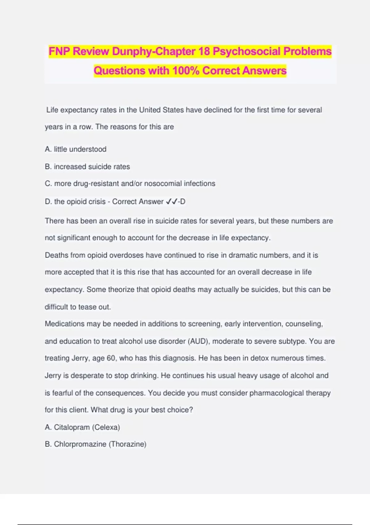 FNP Review Dunphy-Chapter 18 Psychosocial Problems Questions with 100% Correct Answers Life expectancy rates in the United States have declined for the first time for several years in a row. The reasons for this are A. little understood B. increased suicide rates C. more drug-resistant and/or nosocomial infections D. the opioid crisis - Correct Answer ️️ -D There has been an overall rise in suicide rates for several years, but these numbers are not significant enough to account for the decrease in life expectancy. Deaths from opioid overdoses have continued to rise in dramatic numbers, and it is more accepted that it is this rise that has accounted for an overall decrease in life expectancy. Some theorize that opioid deaths may actually be suicides, but this can be difficult to tease out. Medications may be needed in additions to screening, early intervention, counseling, and education to treat alcohol use disorder (AUD), moderate to severe subtype. You are treating Jerry, age 60, who has this diagnosis. He has been in detox numerous times. Jerry is desperate to stop drinking. He continues his usual heavy usage of alcohol and is fearful of the consequences. You decide you must consider pharmacological therapy for this client. What drug is your best choice? A. Citalopram (Celexa) B. Chlorpromazine (Thorazine) C. Naltrexone (Revia) D. Disulfiram (Antabuse) - Correct Answer ️️ -C Naltrexone (Revia), an opioid antagonist thatis a synthetic congener of oxymorphone with no opioid agonist properties, has been used effectively for treatment of AUD in combination with non- pharmacological treatment. It can be started when a patient is still drinking alcohol. Naltrexone usein randomized trials demonstrated lower relapse rates, fewer days drinking, and a decrease in crav- ing for alcohol. There are well-validated screening instru- ments to assist in diagnosing psychosocial problems, as well as tracking progress with treatment. Your patient Gloria, age 29, presents with symptoms of restlessness and anxiety. You decide to have Gloria fill in the following screening instrument. A. GAD-7 B. PHQ-9 C. CAGE screening exam D. Life event checklist (LEC) - Correct Answer ️️ -A The generalized anxiety disorder seven-item (GAD-7) scale should be used to screen for GAD in primary care. It has been found to have acceptable reliability and criterion, construct, factorial, and procedural validity. The GAD-7 is sensitive to change and can be used to monitor symptom severity over time. You are seeing Anthony, age 48, for a new patient visit. He tells you "My biggest problemis trying to deal with a divorce. I didn't want a divorce. I still do not want a divorce. But my wife is leaving!" Your best response is A. "I'm so sorry. No wonder you are upset." B. "Can you tell me about it?" C. "You must be devastated." D. "Sounds like it has been a difficult time." - Correct Answer ️️ -D The statement "Sounds like it has been a difficult time" is the most open-ended response, and most likely to encourage more sharing by the client. It is also the most empathic response. The receptionist in your office calls you into the waiting area. In the area is a new client, pacing, with clenched fists, and a flushed face. He is swearing and yelling. What phase of the aggression cycle is he in? A. Anger B. Triggering C. Escalation D. Crisis - Correct Answer ️️ -C In the escalation phase of this cycle, interventions include taking control of the situation but speaking calmly and nonthreateningly. Convey empathy. Direct the client to take a time out. Listen. Invite him to a quiet room. Offer medication. Aaron, age 10, is brought in to see you, his primary care provider, because he is suffering from enuresis. Your treatment plan includes behavioral modification, positive reinforcement, and the follow- ing medication: A. risperidone (Risperdal). B. imipramine (Tofranil). C. olanzapine (Zyprexa). D. methylphenidate (Ritalin). - Correct Answer ️️ -B There is no cure for bedwetting, but imipramine (Tofranil) may be used to treat enuresis in children ages 6 to 12. Desmopressin acetate (DDAVP), a synthetic form of the hormone vasopressin that decreases the amount of urine produced by the kidney, is also used for treatment of enuresis. You suspect that Mr. Blum, age 69, has major depression. In deciding on what antidepressant to start Mr. Blum on after validating that his symptoms meet the diagnostic criteria for major depression, you know you must consider the following. A. SSRIs are always the best place to start. B. You must consider a variety of factors, such as side effect profile, safety profile, as well as patient preferences, to name just a few. C. It will take at least 4 weeks to see improvement after beginning an SSRI. D. Antidepressants will not be effective unless combined with some form of psychotherapy. - Correct Answer ️️ -B Although there is good evidence that an SSRI may be an effective way to treat an episode of major depression, there are always a variety of factors to consider in any treatment decision. You are working with Janey, age 18, who suffers from bulimia. You encourage her to use the technique of self-monitoring. This involves which of the following? A. Ask the client to make out daily meal plans for 1 week. B. Ask the client to write about all feelings and experiences related to food. C. Teach the client about nutritional content and calories of various foods. D. Encourage the client to ignore feelings and impulses related to food. - Correct Answer ️️ -B