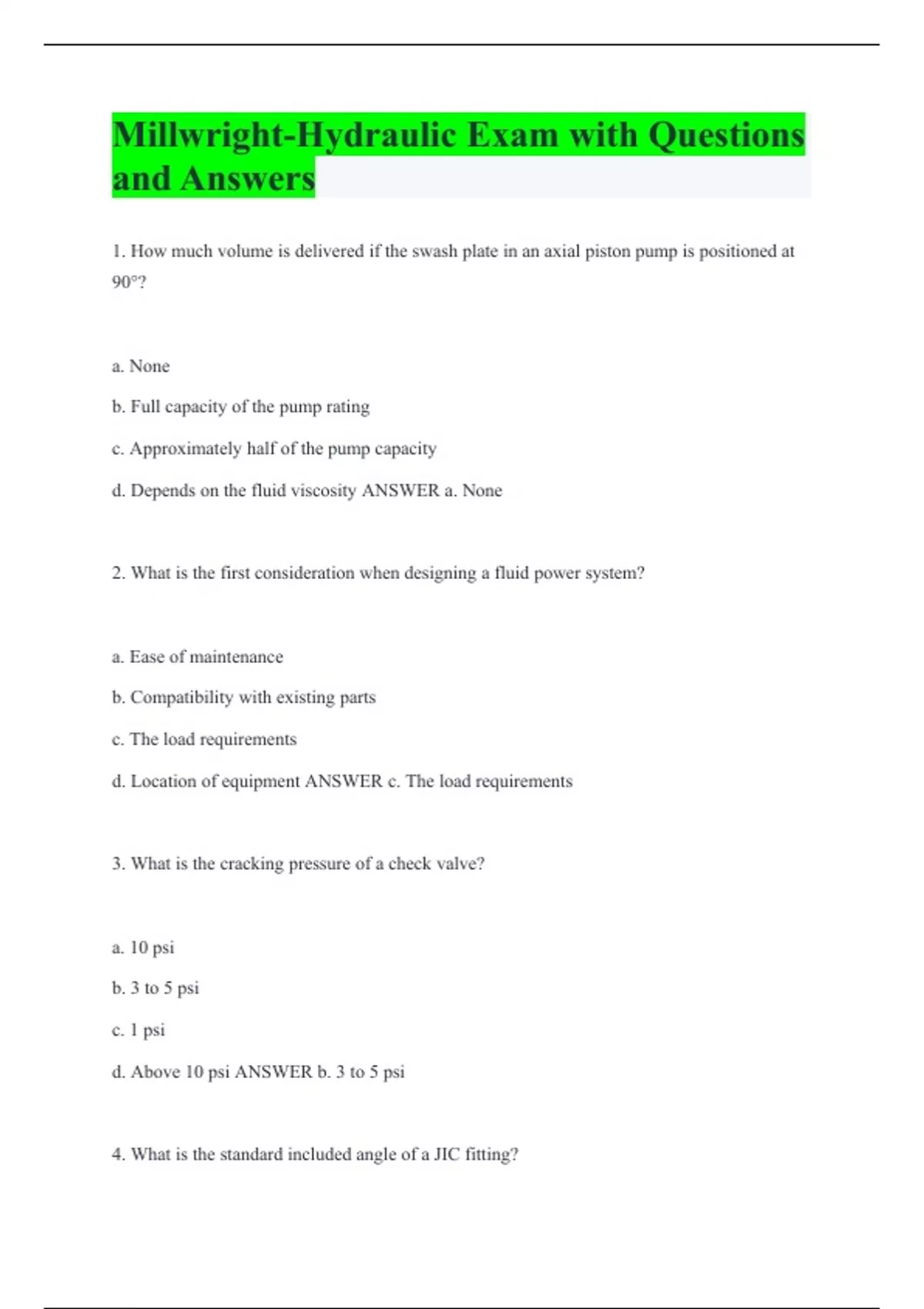 Millwright-Hydraulic Exam with Questions and Answers 1. How much volume is delivered if the swash plate in an axial piston pump is positioned at 90°? a. None b. Full capacity of the pump rating c. Approximately half of the pump capacity d. Depends on the fluid viscosity ANSWER a. None 2. What is the first consideration when designing a fluid power system? a. Ease of maintenance b. Compatibility with existing parts c. The load requirements d. Location of equipment ANSWER c. The load requirements 3. What is the cracking pressure of a check valve? a. 10 psi b. 3 to 5 psi c. 1 psi d. Above 10 psi ANSWER b. 3 to 5 psi 4. What is the standard included angle of a JIC fitting?