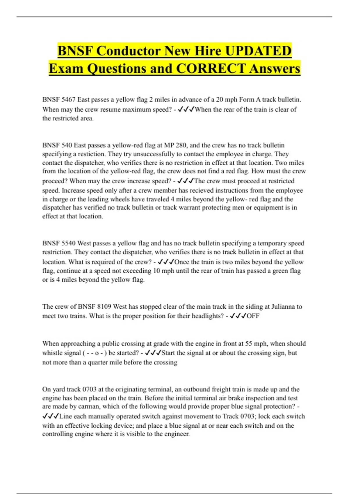 BNSF Conductor New Hire UPDATED Exam Questions and CORRECT Answers