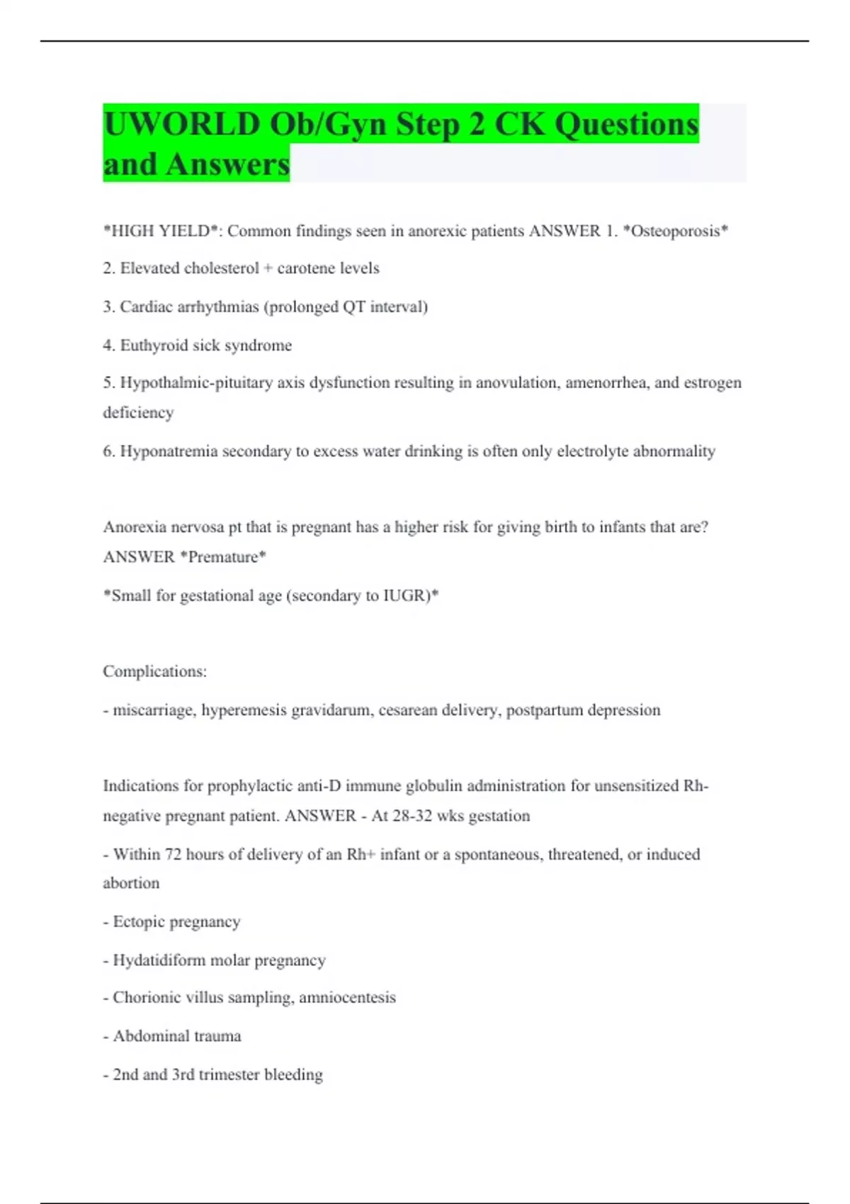 UWORLD Ob/Gyn Step 2 CK Questions and Answers *HIGH YIELD*: Common findings seen in anorexic patients ANSWER 1. *Osteoporosis* 2. Elevated cholesterol + carotene levels 3. Cardiac arrhythmias (prolonged QT interval) 4. Euthyroid sick syndrome 5. Hypothalmic-pituitary axis dysfunction resulting in anovulation, amenorrhea, and estrogen deficiency 6. Hyponatremia secondary to excess water drinking is often only electrolyte abnormality Anorexia nervosa pt that is pregnant has a higher risk for giving birth to infants that are? ANSWER *Premature* *Small for gestational age (secondary to IUGR)* Complications: - miscarriage, hyperemesis gravidarum, cesarean delivery, postpartum depression Indications for prophylactic anti-D immune globulin administration for unsensitized Rh-negative pregnant patient. ANSWER - At 28-32 wks gestation - Within 72 hours of delivery of an Rh+ infant or a spontaneous, threatened, or induced abortion - Ectopic pregnancy - Hydatidiform molar pregnancy - Chorionic villus sampling, amniocentesis - Abdominal trauma - 2nd and 3rd trimester bleeding