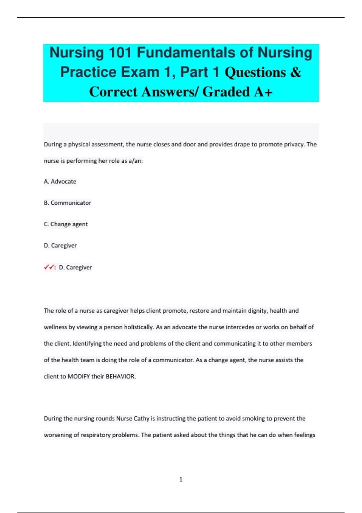 Nursing 101 Fundamentals of Nursing Practice Exam 1, Part 1 Questions & Correct Answers/ Graded A+