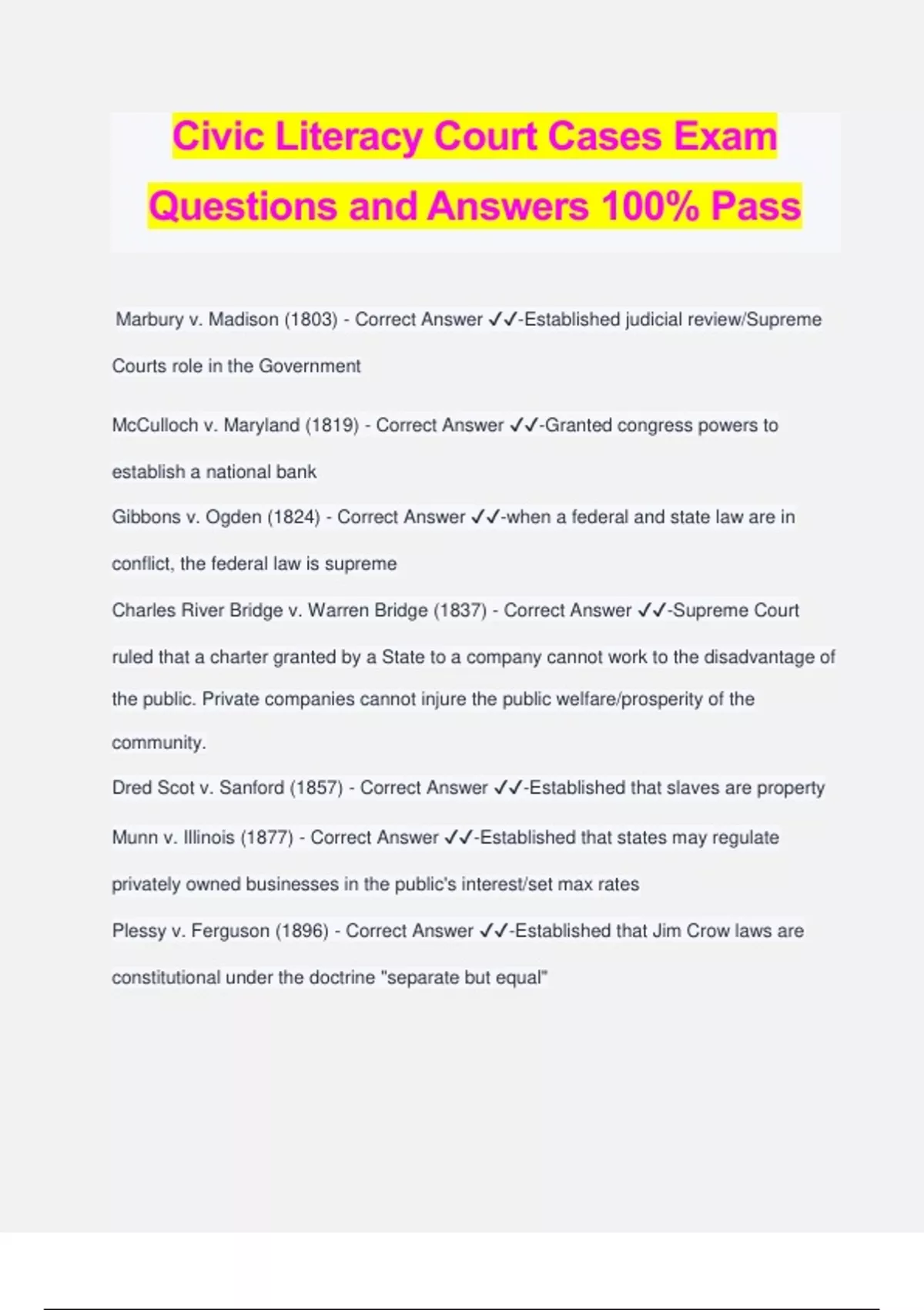Civic Literacy Court Cases Exam Questions and Answers 100% Pass Marbury v. Madison (1803) - Correct Answer ️️ -Established judicial review/Supreme Courts role in the Government McCulloch v. Maryland (1819) - Correct Answer ️️ -Granted congress powers to establish a national bank Gibbons v. Ogden (1824) - Correct Answer ️️ -when a federal and state law are in conflict, the federal law is supreme Charles River Bridge v. Warren Bridge (1837) - Correct Answer ️️ -Supreme Court ruled that a charter granted by a State to a company cannot work to the disadvantage of the public. Private companies cannot injure the public welfare/prosperity of the community. Dred Scot v. Sanford (1857) - Correct Answer ️️ -Established that slaves are property Munn v. Illinois (1877) - Correct Answer ️️ -Established that states may regulate privately owned businesses in the public's interest/set max rates Plessy v. Ferguson (1896) - Correct Answer ️️ -Established that Jim Crow laws are constitutional under the doctrine "separate but equal"