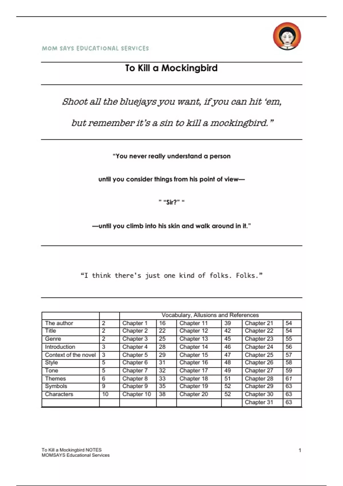 A short, but in-depth study aid for 'To Kill a Mockingbird' including BACKGROUND INFORMATION, discussions around the GENRES (Southern Gothic, Courtroom Drama, Bildungsroman). The document also delves into the CONTEXTof this novel under the headings of The Great Depression, Racial Segregation in America, How American Courts Worked and the Timeline of Events. There is a thorough, but brief discussion on the STYLE and TONE of the novel. The THEMES analysed include the following: Good and Evil, Innocence and the Loss of Innocence, Racism, Social Inequality, Courage and Bravery, Education, Empathy, The Law, Love and Caring, and lastly Revenge. The study aid document further explains the SYMBOLS of Mockingbirds and Boo Radley. There is a section on the CHARACTERS, including all the main characters: Atticus Finch, Scout Finch, Jem Finch, Dill Harris, Calpurnia, Boo Radley, Ms Maudie Atkinson, Ms Rachel Haverford, Ms Stephanie Crawford, Ms Henry Lafayette Dubose, Bob Ewell, Mayella Ewell, Tom Robinson, and the minor roles such as Aunt Alexandra, Heck Tate and Cecil Jacobs, Dr Dolphus Raymond and Ms Caroline Fisher. The next section is divided into CHAPTERS (1 - 31), exploring the colloquial language (VOCABULARY), with explanations, ALLUSIONS (an implied or indirect reference to a person, event, or thing or to another text) and REFERENCES (characters, space and place).