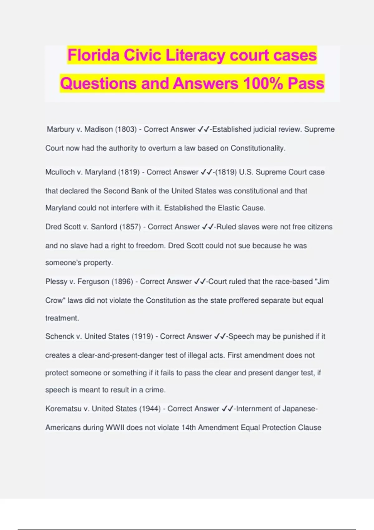 Florida Civic Literacy court cases Questions and Answers 100% Pass Marbury v. Madison (1803) - Correct Answer ️️ -Established judicial review. Supreme Court now had the authority to overturn a law based on Constitutionality. Mculloch v. Maryland (1819) - Correct Answer ️️ -(1819) U.S. Supreme Court case that declared the Second Bank of the United States was constitutional and that Maryland could not interfere with it. Established the Elastic Cause. Dred Scott v. Sanford (1857) - Correct Answer ️️ -Ruled slaves were not free citizens and no slave had a right to freedom. Dred Scott could not sue because he was someone's property. Plessy v. Ferguson (1896) - Correct Answer ️️ -Court ruled that the race-based "Jim Crow" laws did not violate the Constitution as the state proffered separate but equal treatment. Schenck v. United States (1919) - Correct Answer ️️ -Speech may be punished if it creates a clear-and-present-danger test of illegal acts. First amendment does not protect someone or something if it fails to pass the clear and present danger test, if speech is meant to result in a crime. Korematsu v. United States (1944) - Correct Answer ️️ -Internment of Japanese- Americans during WWII does not violate 14th Amendment Equal Protection Clause (gets strict scrutiny but national security is a good enough reason to justify the racial discrimination). Brown vs. Board of Education (1954) - Correct Answer ️️ -Supreme Court decision that overturned the Plessy vs. Ferguson decision (1896); led by Chief Justice Earl Warren, the Court ruled that "separate but equal" schools for blacks were inherently unequal and thus unconstitutional. The decision energized the Civil Rights Movement in the 1950s and 1960s. Mapp v. Ohio (1961) - Correct Answer ️️ -Evidence illegally gathered by the police may not be used in a criminal trial. Baker v. Carr (1962) - Correct Answer ️️ -Established the principle of "one person, one vote" and made such patterns of representation illegal. The Court asserted that the federal courts had the right to tell states to reapportion their districts for more equal representation. Engle v. Vitale (1962) - Correct Answer ️️ -Held that public schools cannot require students to say prayers Gideon v. Wainwright (1963) - Correct Answer ️️ -Extends to the defendant the right of counsel in all state and federal criminal trials regardless of their ability to pay. Miranda v. Arizona (1966) ie; Miranda Rights - Correct Answer ️️ -5th Amendment self-incrimination clause requires government agents to warn suspects of their right to remain silent and/or contact an attorney before questioning them when they are in custody. Statements made without Miranda Warning are inadmissible in court (like the exclusionary rule for evidence) Tinker v. Des Moines (1969) - Correct Answer ️️ -Public school students may wear armbands to class protesting against America's war in Vietnam when such display does not disrupt classes. Students DO NOT lose their first amendment when they enter school. New York Times v. US (1971) - Correct Answer ️️ -Did the Nixon administration's efforts to prevent the publication of what it termed "classified information" violate the First Amendment? Yes, the court ruled that the publication would not cause a direct, immediate event imperiling the safety of American forces, prior restraint was unjustified. Wisconsin v. Yoder (1972) - Correct Answer ️️ -Compelling Amish students to attend school past the eighth grade violates the free exercise clause of religion. Roe v. Wade (1973) - Correct Answer ️️ -The constitution recogn