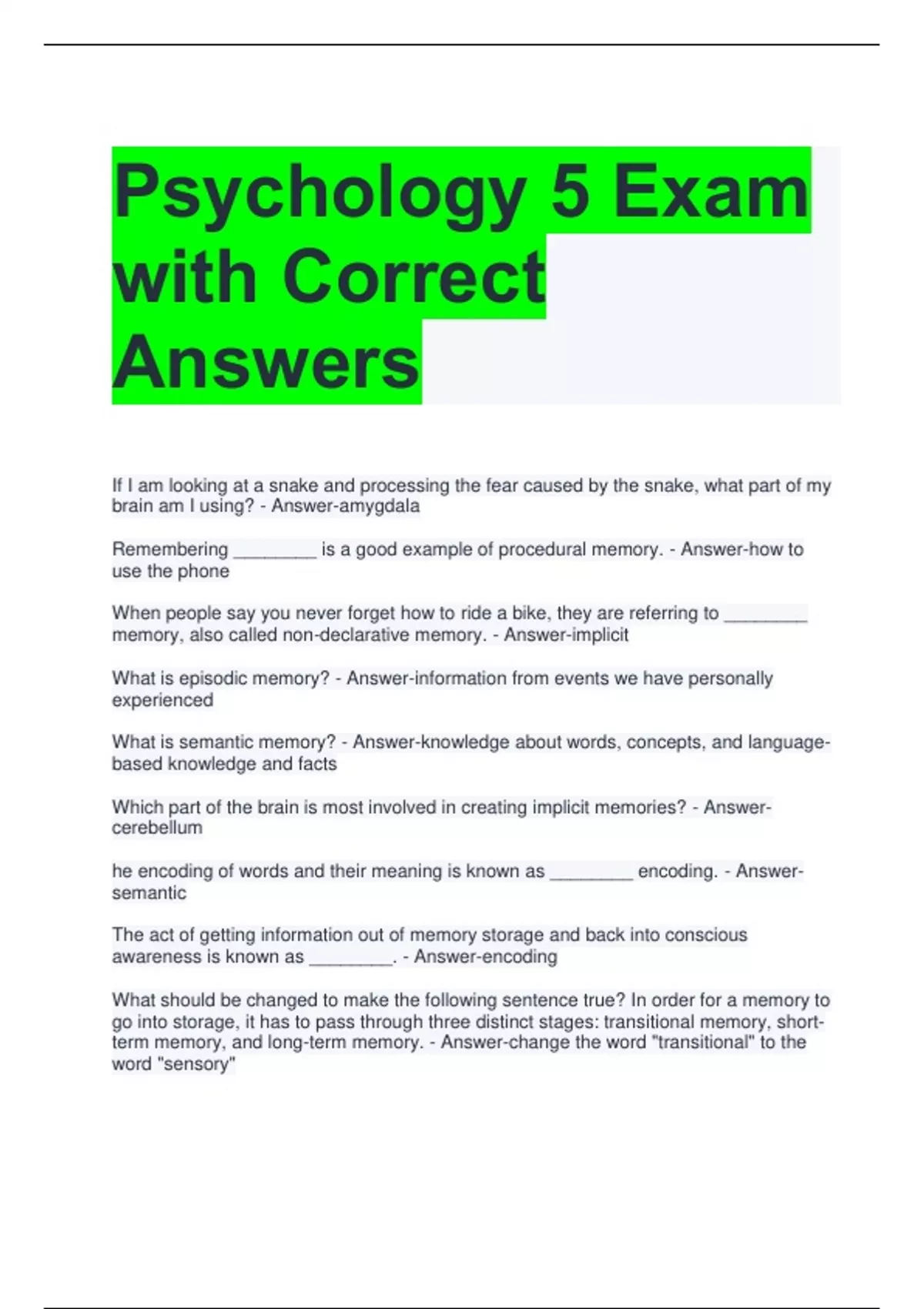Psychology 5 Exam with Correct Answers If I am looking at a snake and processing the fear caused by the snake, what part of my brain am I using? - Answer-amygdala Remembering ________ is a good example of procedural memory. - Answer-how to use the phone When people say you never forget how to ride a bike, they are referring to ________ memory, also called non-declarative memory. - Answer-implicit What is episodic memory? - Answer-information from events we have personally experienced What is semantic memory? - Answer-knowledge about words, concepts, and language-based knowledge and facts Which part of the brain is most involved in creating implicit memories? - Answer-cerebellum he encoding of words and their meaning is known as ________ encoding. - Answer-semantic The act of getting information out of memory storage and back into conscious awareness is known as ________. - Answer-encoding What should be changed to make the following sentence true? In order for a memory to go into storage, it has to pass through three distinct stages: transitional memory, short-term memory, and long-term memory. - Answer-change the word "transitional" to the word "sensory"