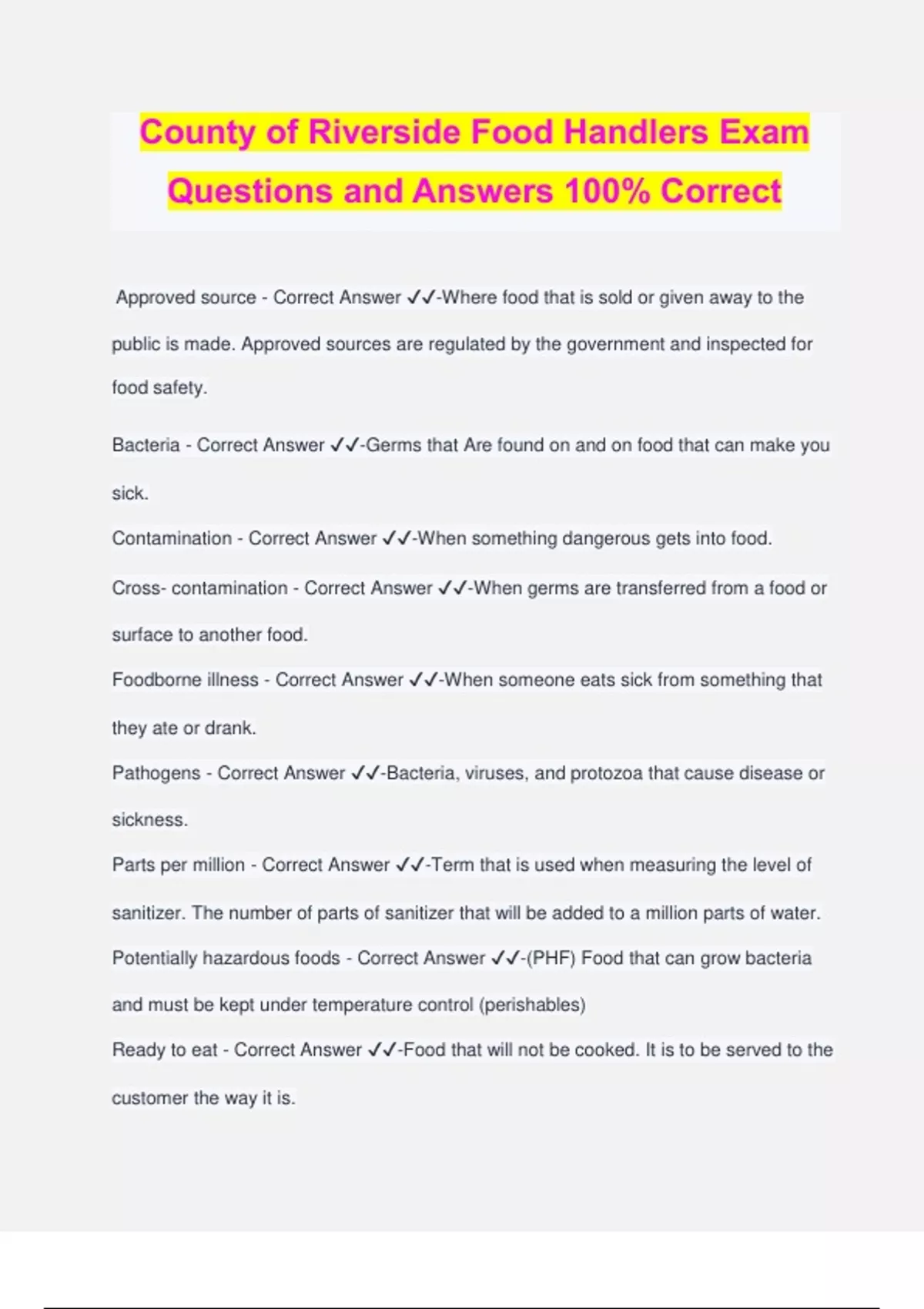 County of Riverside Food Handlers Exam Questions and Answers 100% Correct