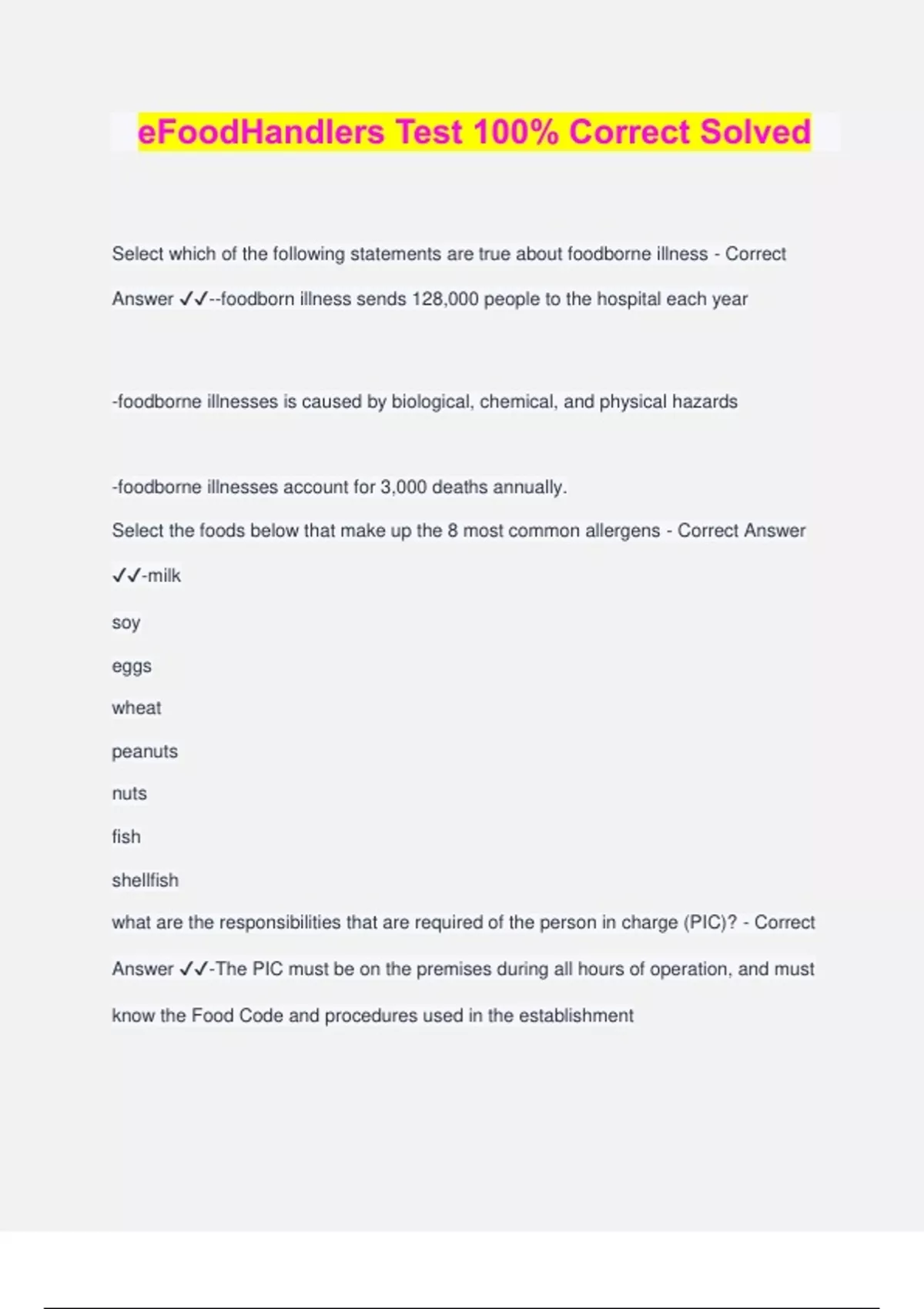 eFoodHandlers Test 100% Correct Solved Select which of the following statements are true about foodborne illness - Correct Answer ️️ --foodborn illness sends 128,000 people to the hospital each year -foodborne illnesses is caused by biological, chemical, and physical hazards -foodborne illnesses account for 3,000 deaths annually. Select the foods below that make up the 8 most common allergens - Correct Answer ️️ -milk soy eggs wheat peanuts nuts fish shellfish what are the responsibilities that are required of the person in charge (PIC)? - Correct Answer ️️ -The PIC must be on the premises during all hours of operation, and must know the Food Code and procedures used in the establishment They should be able to answer all employee questions regarding food and safety, and provide training on how to perform jobs correctly The most important hygiene practice? - Correct Answer ️️ -proper hand washing Using what you learned in the video, write down when food handlers are required to wash their hands during the work day. - Correct Answer ️️ --before you begin food preparation -when you have been contaminated by exposure to potential germs -using the bathroom -touching your face or nose -Handling raw meat, fish, or poultry -sneezing, coughing, or blowing your nose -handling garbage or dirty dishes -handling animals, money, or using chemicals -after taking a break, eating or smoking -if you aren't sure if a wash is necessary, wash anyway just to be safe can you use the dishwashing sink to wash your hands if you are doing work in the kitchen? - Correct Answer ️️ -no can a food server use hand sanitizer in place of hand washing when no soap is available? - Correct Answer ️️ -no 6 steps of handwashing - Correct Answer ️️ -1- get hands wet 2- apply soap and scrub 3- scrub hands together for minimum 20 sec 4-scrub backs of hands and between fingers 5- rinse for about 5 sec 6- dry with air dryer, paper, or continuous cloth towel how do you prevent barehand contact? - Correct Answer ️️ --scoops -deli papers -tongs -single use gloves -utensils Which food type must be kept out of the danger zone - Correct Answer ️️ -meat
