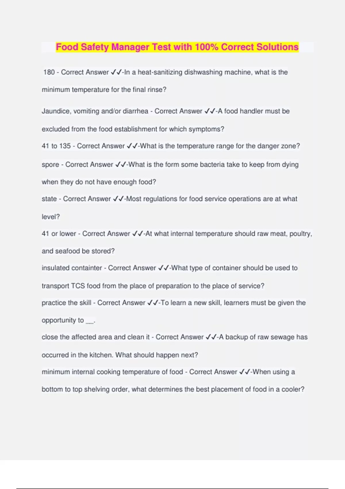 Food Safety Manager Test with 100% Correct Solutions 180 - Correct Answer ️️ -In a heat-sanitizing dishwashing machine, what is the minimum temperature for the final rinse? Jaundice, vomiting and/or diarrhea - Correct Answer ️️ -A food handler must be excluded from the food establishment for which symptoms? 41 to 135 - Correct Answer ️️ -What is the temperature range for the danger zone? spore - Correct Answer ️️ -What is the form some bacteria take to keep from dying when they do not have enough food? state - Correct Answer ️️ -Most regulations for food service operations are at what level? 41 or lower - Correct Answer ️️ -At what internal temperature should raw meat, poultry, and seafood be stored? insulated containter - Correct Answer ️️ -What type of container should be used to transport TCS food from the place of preparation to the place of service? practice the skill - Correct Answer ️️ -To learn a new skill, learners must be given the opportunity to __. close the affected area and clean it - Correct Answer ️️ -A backup of raw sewage has occurred in the kitchen. What should happen next? minimum internal cooking temperature of food - Correct Answer ️️ -When using a bottom to top shelving order, what determines the best placement of food in a cooler? cross-connection - Correct Answer ️️ -A hose connected to a running faucet that is left submerged in a bucket is an example of what? sneezing, itching, vomiting, nausea, cramps, diarrhea, hives, rashes, eczema, etc. - Correct Answer ️️ -A customer having an allergic reaction may show which 9+ symptoms? pasteurized - Correct Answer ️️ -Raw or undercooked dishes made for highly- susceptible populations (HSPs) must use eggs that have been __. Exposure Time, Temperature (Avoid 131F+), Concentration, Water pH and Hardness (Avoid 7.5+); Not the Liquid's Color - Correct Answer ️️ -The effectiveness of chemical sanitizers are effected by __, __, __, and __, but NOT its __. state or local regulatory authority - Correct Answer ️️ -Which agencies enforces food safety in a food service operation? time-temperature abuse - Correct Answer ️️ -What can cause histamine to form in tuna? 1. deny pests access to the operation 2. deny pests food, water, and a nesting or hiding place 3. work with a licensed PCO to eliminate pests that do enter the operation - Correct Answer ️️ -What are the three rules of an integrated pest management program (IPM) program? 16 mesh per square inch screening - Correct Answer ️️ -All screens for windows and vents must meet this requirement. touching the walls - Correct Answer ️️ -When deciding were to place dry goods for storage in a dry-storage area it is important that the dry goods NOT be ____. 90 days after the container has been emptied or the last shellfish that was served from the container - Correct Answer ️️ -How long must shellstock tags be kept on file? 24 hours - Correct Answer ️️ -You should label all ready to eat TCS food that is prepped in house and held longer than ___. vacuum-breaker - Correct Answer ️️ -What is the only certain way to prevent backflow? when hired, daily (i.e. on-the-job), weekly, monthly, quarterly, and whenever nec