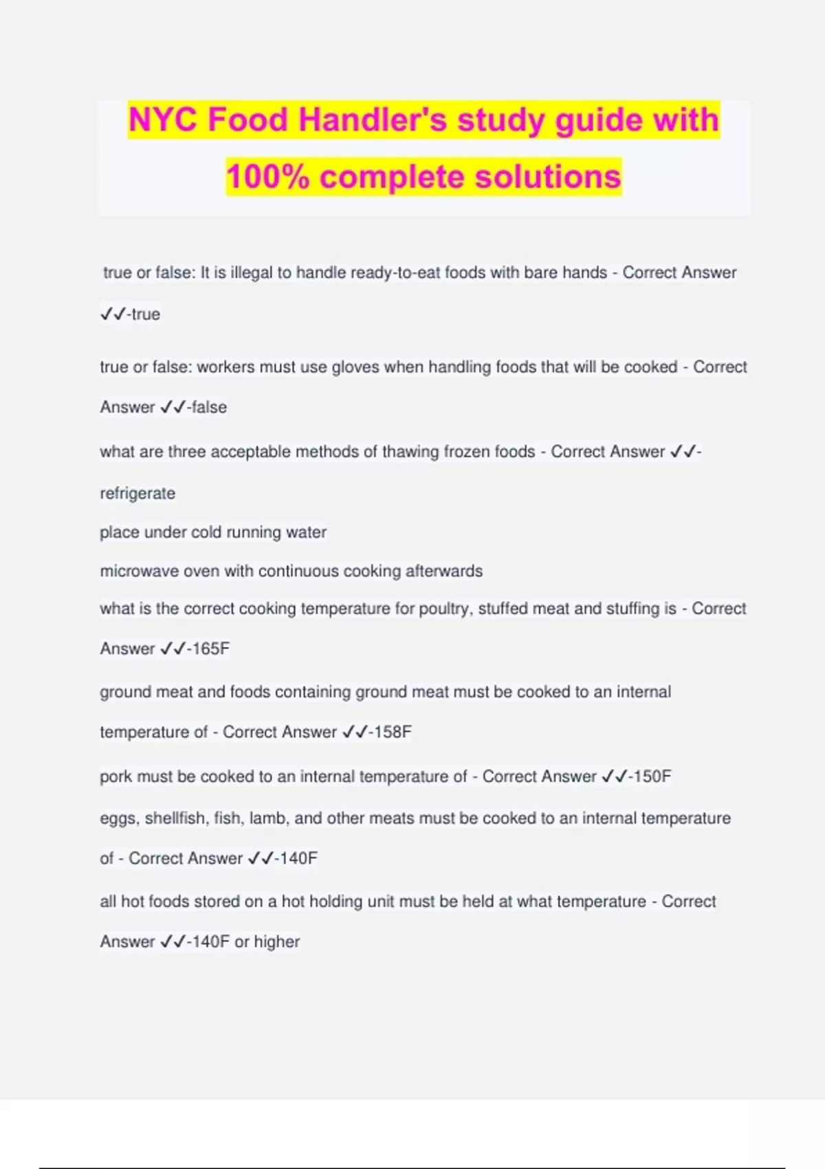 NYC Food Handler's study guide with 100% complete solutions true or false: It is illegal to handle ready-to-eat foods with bare hands - Correct Answer ️️ -true true or false: workers must use gloves when handling foods that will be cooked - Correct Answer ️️ -false what are three acceptable methods of thawing frozen foods - Correct Answer ️️ - refrigerate place under cold running water microwave oven with continuous cooking afterwards what is the correct cooking temperature for poultry, stuffed meat and stuffing is - Correct Answer ️️ -165F ground meat and foods containing ground meat must be cooked to an internal temperature of - Correct Answer ️️ -158F pork must be cooked to an internal temperature of - Correct Answer ️️ -150F eggs, shellfish, fish, lamb, and other meats must be cooked to an internal temperature of - Correct Answer ️️ -140F all hot foods stored on a hot holding unit must be held at what temperature - Correct Answer ️️ -140F or higher what are effective ways to rapidly cool foods are - Correct Answer ️️ -immersion in an ice water bath with occasional stirring, use of 4 inches shallow cooking pots with a product depth of 1 to 2 inches using a rapid chill unit, and cutting solid foods into smaller pieces (6lbs or less) hot foods placed in a refrigerator for cooling must be covered only after they have been completely cooled to what temperature - Correct Answer ️️ -41F or below previously cooked and refrigerated foods that will served from a hot holding unit must be - Correct Answer ️️ -rapidly reheated to 165F using a stove or an oven true or false: never use a hot holding unit to reheat foods - Correct Answer ️️ -true when using gloves, what should you do to prevent contamination - Correct Answer ️️ - change gloves often what must be provided in all culinary and pot/dish washing sinks - Correct Answer ️️ - air breaks what must be installed in any equipment that has a direct connection with potable water supply (ice machine, coffee machine, dish washer) - Correct Answer ️️ -atmospheric vacuum breakers how can cross connection be prevented - Correct Answer ️️ -by installing a hose-bib vacuum breaker all gas fired hot water heaters must be - Correct Answer ️️ -installed by licensed plumber monitored for back draft grease needs to be dumped in a sink with what - Correct Answer ️️ -a proper grease interceptor what is the proper sequence for the manual dish washing operations - Correct Answer ️️ -wash rinse sanitize air dry between each use, what needs to be done with cutting boards - Correct Answe