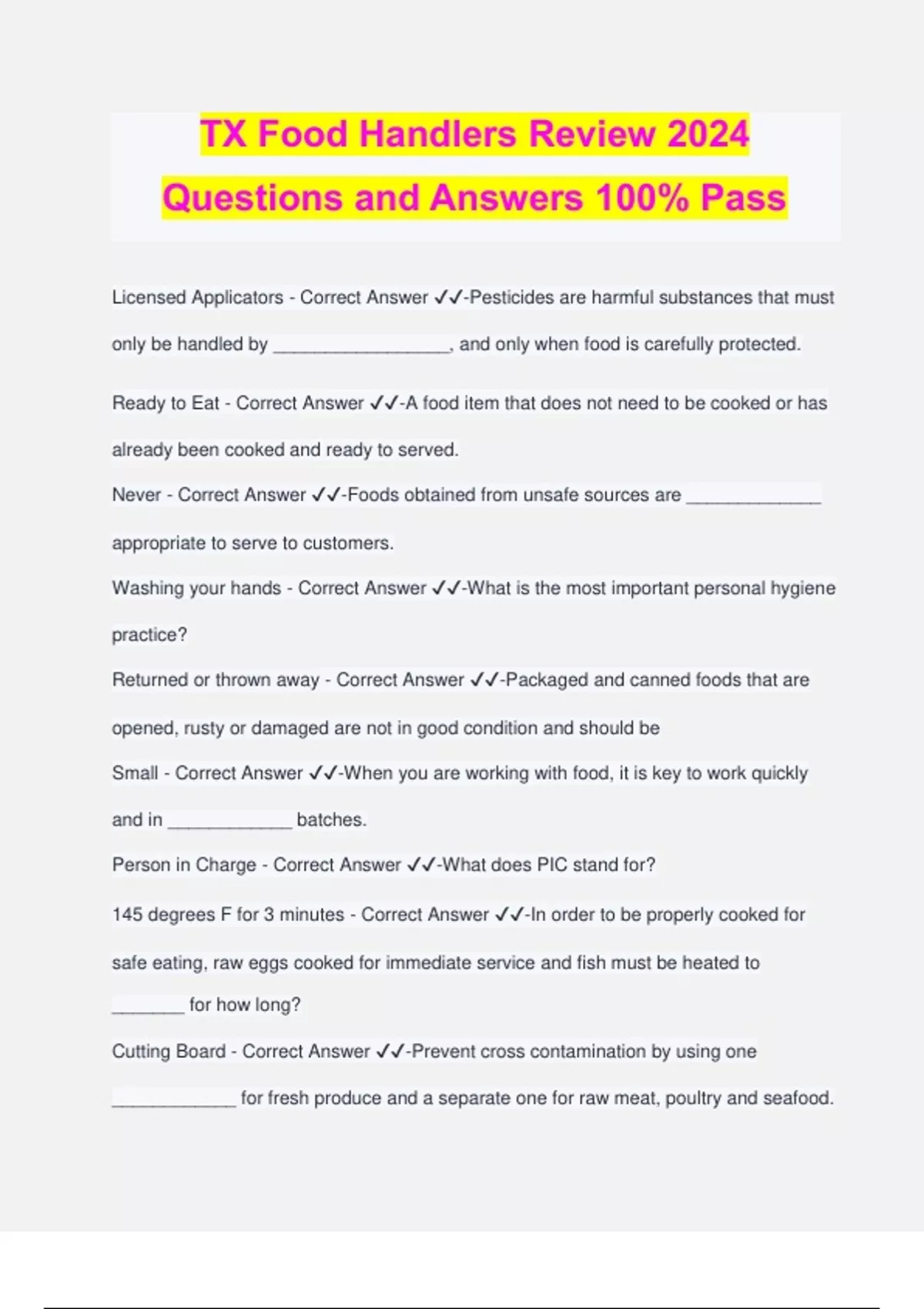 TX Food Handlers Review 2024 Questions and Answers 100% Pass Licensed Applicators - Correct Answer ️️ -Pesticides are harmful substances that must only be handled by _________________, and only when food is carefully protected. Ready to Eat - Correct Answer ️️ -A food item that does not need to be cooked or has already been cooked and ready to served. Never - Correct Answer ️️ -Foods obtained from unsafe sources are _____________ appropriate to serve to customers. Washing your hands - Correct Answer ️️ -What is the most important personal hygiene practice? Returned or thrown away - Correct Answer ️️ -Packaged and canned foods that are opened, rusty or damaged are not in good condition and should be Small - Correct Answer ️️ -When you are working with food, it is key to work quickly and in ____________ batches. Person in Charge - Correct Answer ️️ -What does PIC stand for? 145 degrees F for 3 minutes - Correct Answer ️️ -In order to be properly cooked for safe eating, raw eggs cooked for immediate service and fish must be heated to _______ for how long? Cutting Board - Correct Answer ️️ -Prevent cross contamination by using one ____________ for fresh produce and a separate one for raw meat, poultry and seafood.