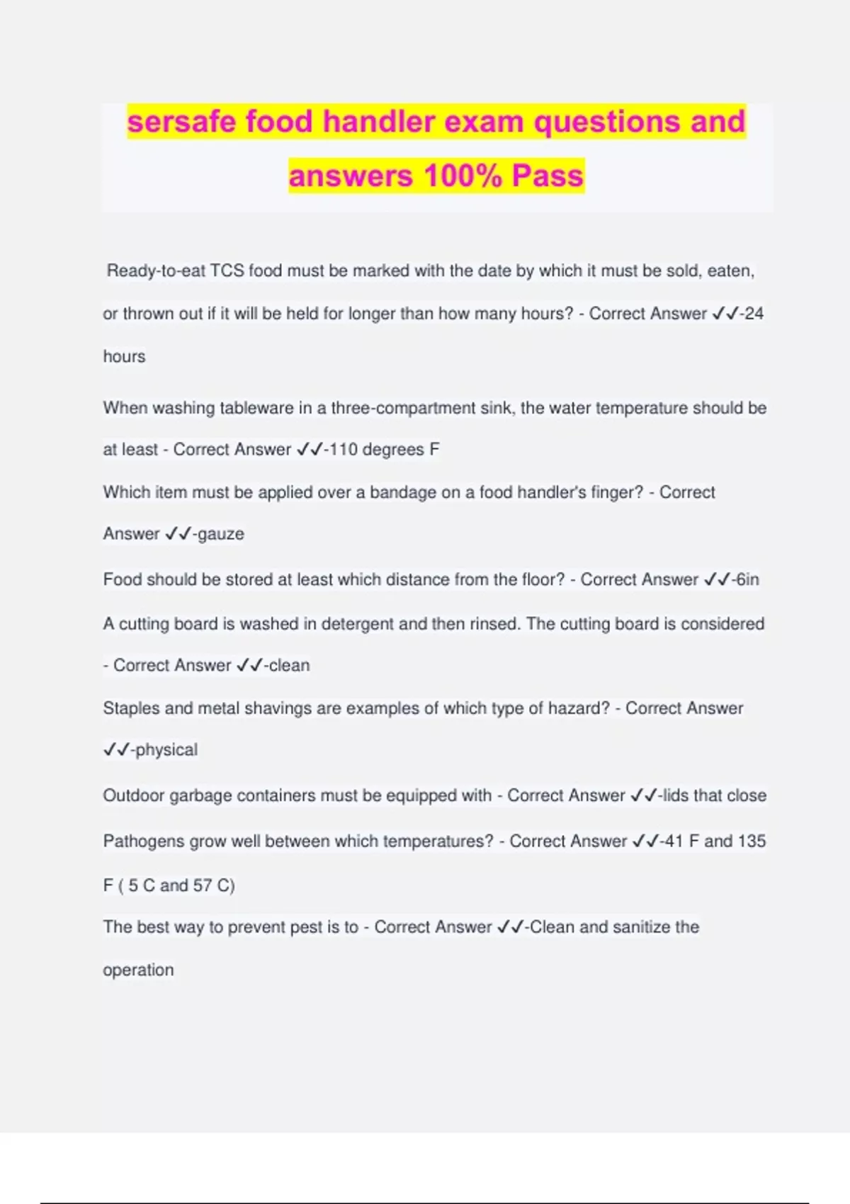 sersafe food handler exam questions and answers 100% Pass Ready-to-eat TCS food must be marked with the date by which it must be sold, eaten, or thrown out if it will be held for longer than how many hours? - Correct Answer ️️ -24 hours When washing tableware in a three-compartment sink, the water temperature should be at least - Correct Answer ️️ -110 degrees F Which item must be applied over a bandage on a food handler's finger? - Correct Answer ️️ -gauze Food should be stored at least which distance from the floor? - Correct Answer ️️ -6in A cutting board is washed in detergent and then rinsed. The cutting board is considered - Correct Answer ️️ -clean Staples and metal shavings are examples of which type of hazard? - Correct Answer ️️ -physical Outdoor garbage containers must be equipped with - Correct Answer ️️ -lids that close Pathogens grow well between which temperatures? - Correct Answer ️️ -41 F and 135 F ( 5 C and 57 C) The best way to prevent pest is to - Correct Answer ️️ -Clean and sanitize the operation Cans of soda are stored on ice behind the bar. A manager sees a food handler scooping some of this ice to fill a customer's drink. What should the manager tell the food handler? - Correct Answer ️️ -Ice used to keep beverages cold cannot be used for anything else Food handlers who scrub their hands and arms with soap for how many seconds have washed their hands correctly? - Correct Answer ️️ -13 What is an example of a physical contaminant? - Correct Answer ️️ -dirt Removing an apron before using the restroom is an example of - Correct Answer ️️ - Preventing cross-contamination How should a food handler test the temperature of food? - Correct Answer ️️ -Use a clean and sanitized thermometer The top of the plate where food is placed is called? - Correct Answer ️️ -Food-contact surface A food handler washes his or her hands after using the restroom. This is an example of - Correct Answer ️️ -Practicing good personal hygiene What should be done with dishware before washing it in a dishwasher? - Correct Answer ️️ -Scrape or rinse it