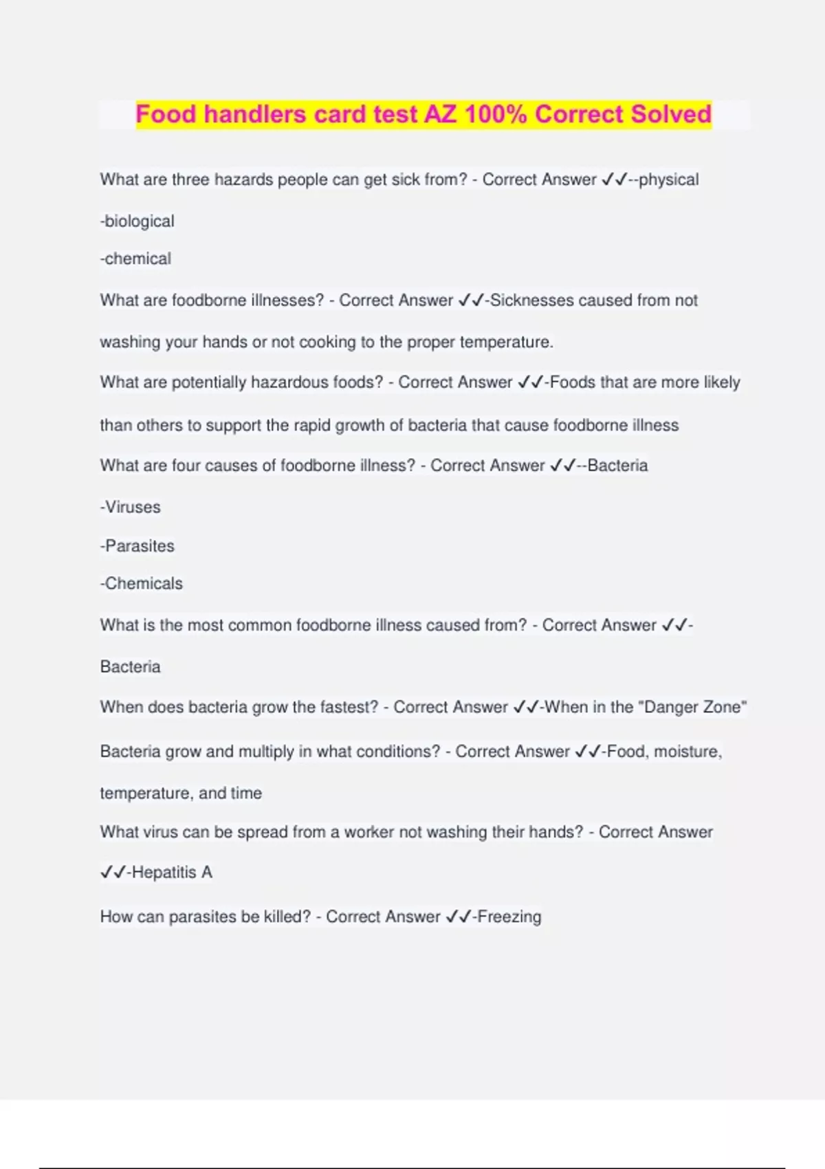 Food handlers card test AZ 100% Correct Solved What are three hazards people can get sick from? - Correct Answer ️️ --physical -biological -chemical What are foodborne illnesses? - Correct Answer ️️ -Sicknesses caused from not washing your hands or not cooking to the proper temperature. What are potentially hazardous foods? - Correct Answer ️️ -Foods that are more likely than others to support the rapid growth of bacteria that cause foodborne illness What are four causes of foodborne illness? - Correct Answer ️️ --Bacteria -Viruses -Parasites -Chemicals What is the most common foodborne illness caused from? - Correct Answer ️️ - Bacteria When does bacteria grow the fastest? - Correct Answer ️️ -When in the "Danger Zone" Bacteria grow and multiply in what conditions? - Correct Answer ️️ -Food, moisture, temperature, and time What virus can be spread from a worker not washing their hands? - Correct Answer ️️ -Hepatitis A How can parasites be killed? - Correct Answer ️️ -Freezing How can you tell if a food is contaminated? - Correct Answer ️️ -It may look or smell weird. However, sometimes it can look and smell fine but still make someone sick. What are the four R's when dealing with someone with food allergies? - Correct Answer ️️ --Refer -Review -Remember -Respond How long should you wash your hands? - Correct Answer ️️ -20 seconds How do you wash hands? Steps - Correct Answer ️️ -1. Wet