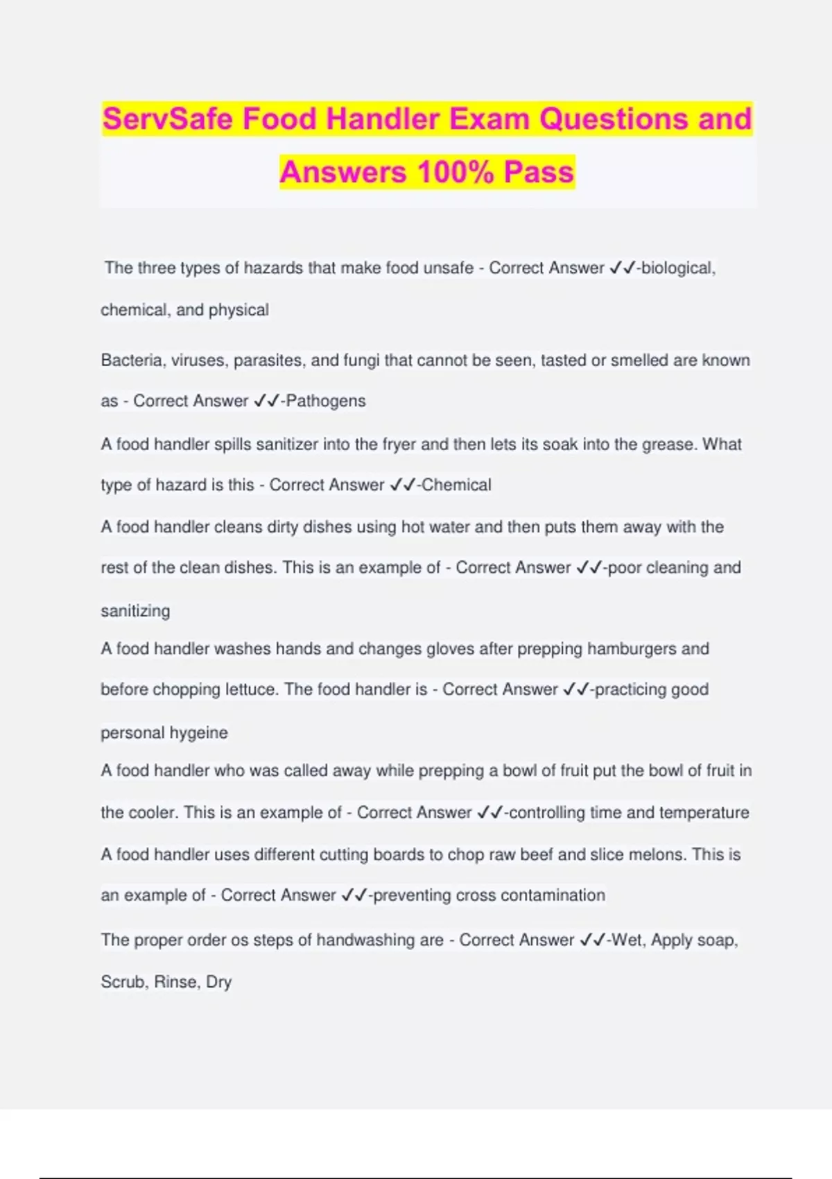 ServSafe Food Handler Exam Questions and Answers 100% Pass The three types of hazards that make food unsafe - Correct Answer ️️ -biological, chemical, and physical Bacteria, viruses, parasites, and fungi that cannot be seen, tasted or smelled are known as - Correct Answer ️️ -Pathogens A food handler spills sanitizer into the fryer and then lets its soak into the grease. What type of hazard is this - Correct Answer ️️ -Chemical A food handler cleans dirty dishes using hot water and then puts them away with the rest of the clean dishes. This is an example of - Correct Answer ️️ -poor cleaning and sanitizing A food handler washes hands and changes gloves after prepping hamburgers and before chopping lettuce. The food handler is - Correct Answer ️️ -practicing good personal hygeine A food handler who was called away while prepping a bowl of fruit put the bowl of fruit in the cooler. This is an example of - Correct Answer ️️ -controlling time and temperature A food handler uses different cutting boards to chop raw beef and slice melons. This is an example of - Correct Answer ️️ -preventing cross contamination The proper order os steps of handwashing are - Correct Answer ️️ -Wet, Apply soap, Scrub, Rinse, Dry