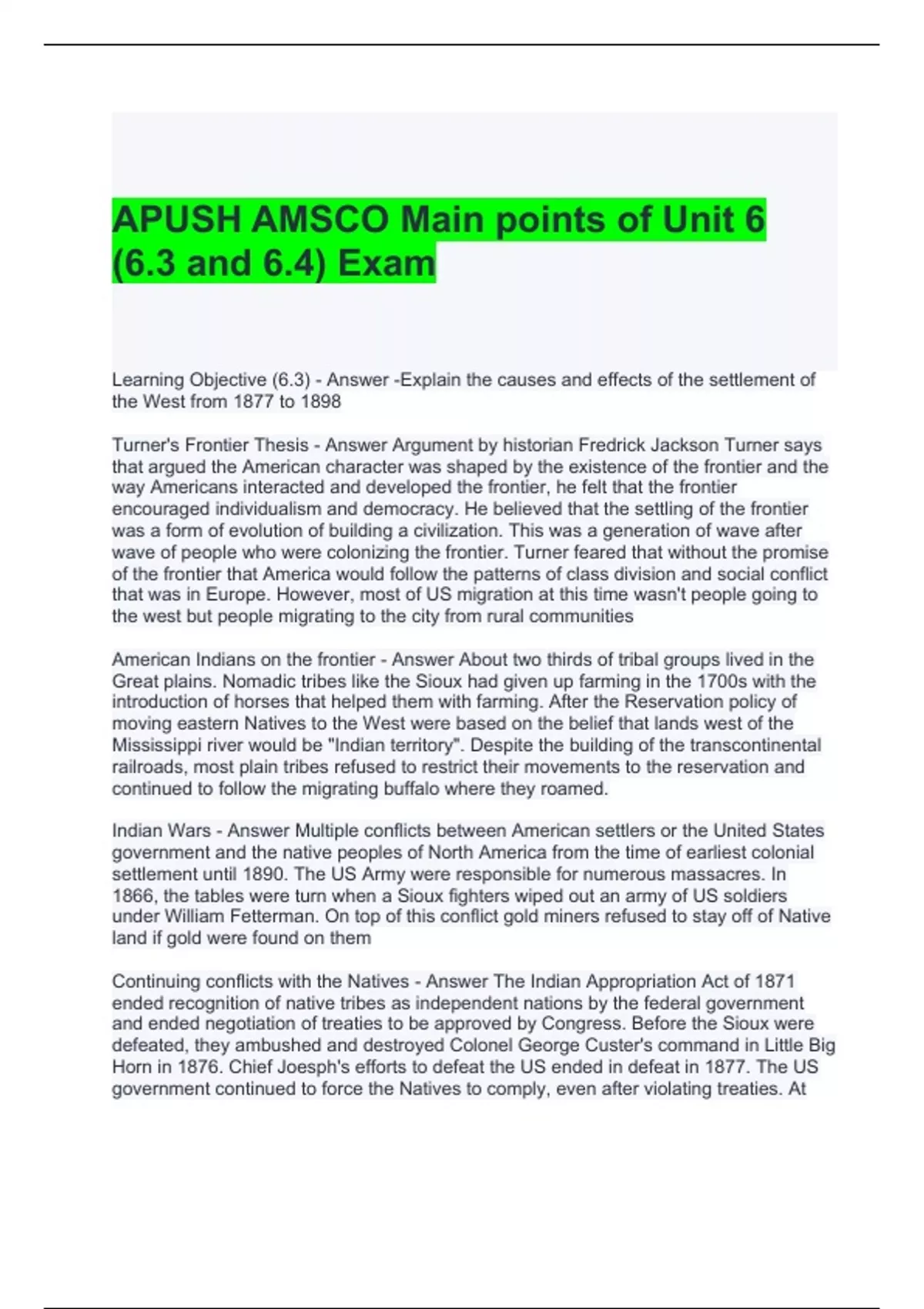APUSH AMSCO Main points of Unit 6 (6.3 and 6.4) Exam Questions and Answers