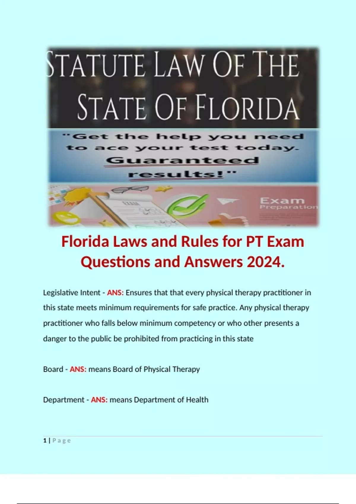 Florida Laws and Rules for PT Exam Questions and Answers 2024.