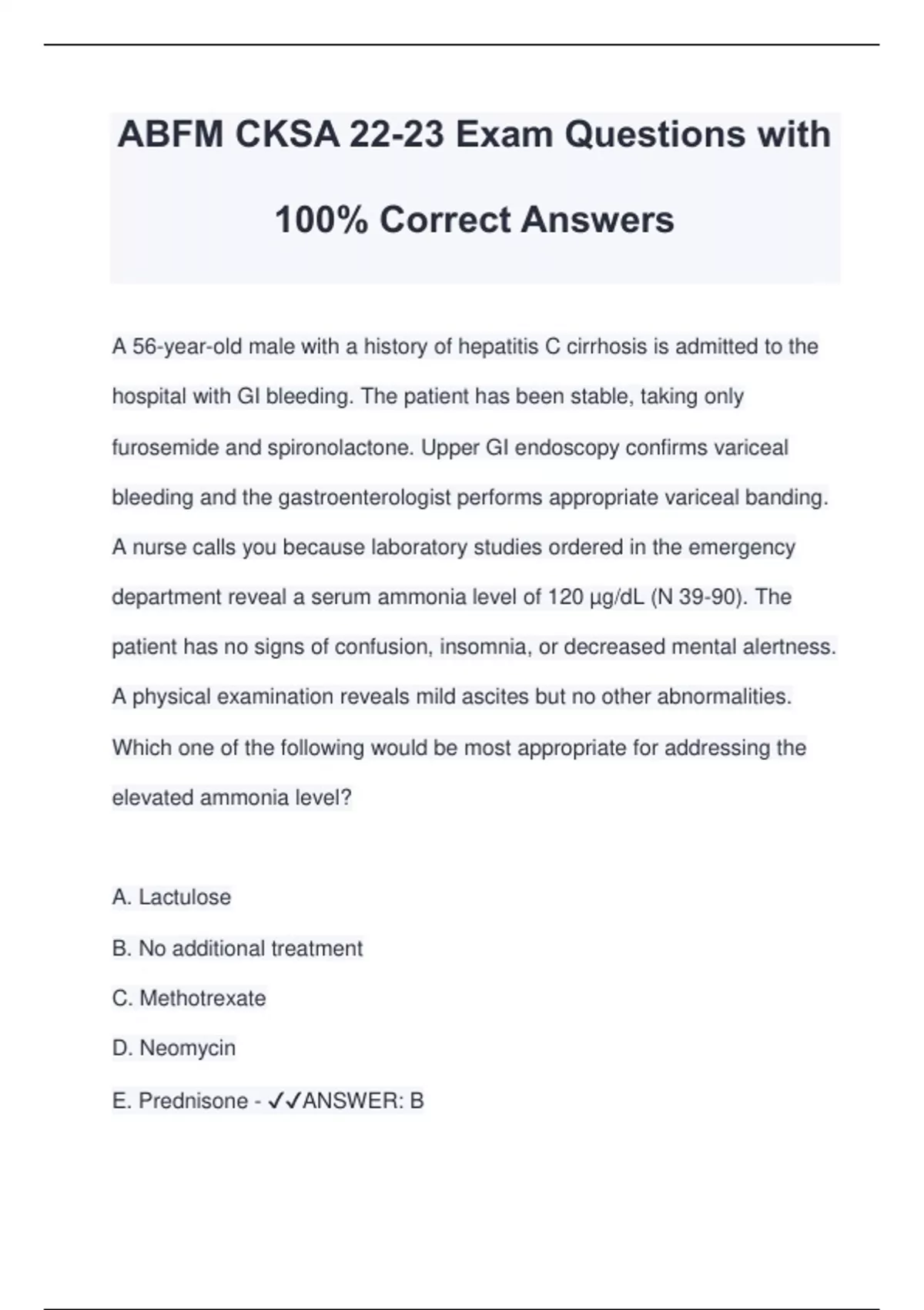 ABFM CKSA 22-23 Exam Questions with 100% Correct Answers A 56-year-old male with a history of hepatitis C cirrhosis is admitted to the hospital with GI bleeding. The patient has been stable, taking only furosemide and spironolactone. Upper GI endoscopy confirms variceal bleeding and the gastroenterologist performs appropriate variceal banding. A nurse calls you because laboratory studies ordered in the emergency department reveal a serum ammonia level of 120 µg/dL (N 39-90). The patient has no signs of confusion, insomnia, or decreased mental alertness. A physical examination reveals mild ascites but no other abnormalities. Which one of the following would be most appropriate for addressing the elevated ammonia level? A. Lactulose B. No additional treatment C. Methotrexate D. Neomycin E. Prednisone - ANSWER: B Elevated ammonia levels may occur in multiple clinical scenarios (i.e. portosystemic shunting, UTI from urease-producing organisms, GI bleeding, shock, renal disease, parenteral nutrition, salicylate intoxication, alcohol use). In patients with chronic liver disease, hepatic encephalopathy is diagnosed based on the overall clinical presentation and not by an ammonia level. It is important to remember that a normal ammonia level neither excludes nor confirms the diagnosis of hepatic encephalopathy. This patient had an elevated serum ammonia level that was found incidentally during his hospital admission for gastrointestinal bleeding. Because there is no clinically significant encephalopathy, treatment based on ammonia levels is not indicated. Lactulose, methotrexate, neomycin, or prednisone would not be appropriate. A 33-year-old female presents with palpitations and excessive sweating. A physical examination is normal. Laboratory findings include a TSH (thyrotropin) level of 0.02 µU/mL (N 0.40-4.00) and a free T4 level of 3.9 ng/dL (N 0.7-1.9). Radionuclide scanning reveals no uptake. Which one of the following would explain these findings? A. Thyroid hormone resistance B. Graves disease C. A toxic nodular goiter D. Excess thyroid hormone intake E. A thyrotropin-secreting pituitary tumor - ANSWER: D