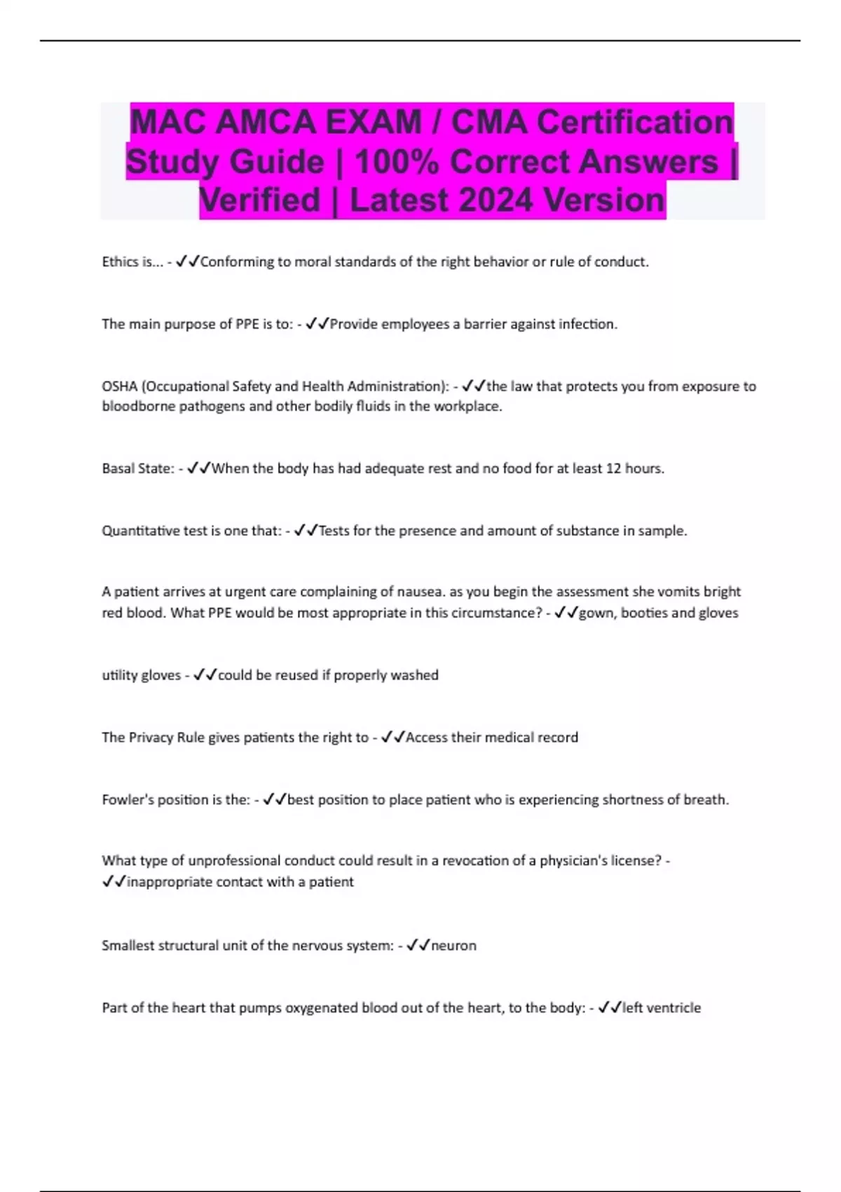 MAC AMCA EXAM / CMA Certification Study Guide | 100% Correct Answers | Verified | Latest 2024 Version