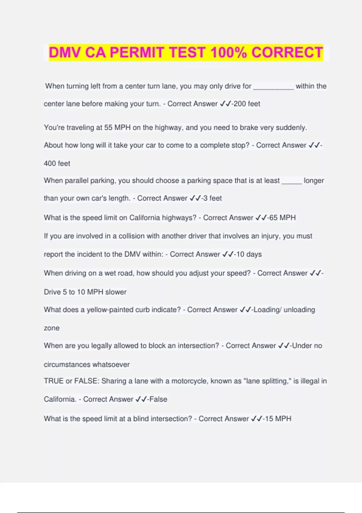 DMV CA PERMIT TEST 100% CORRECT When turning left from a center turn lane, you may only drive for __________ within the center lane before making your turn. - Correct Answer ️️ -200 feet You're traveling at 55 MPH on the highway, and you need to brake very suddenly. About how long will it take your car to come to a complete stop? - Correct Answer ️️ - 400 feet When parallel parking, you should choose a parking space that is at least _____ longer than your own car's length. - Correct Answer ️️ -3 feet What is the speed limit on California highways? - Correct Answer ️️ -65 MPH If you are involved in a collision with another driver that involves an injury, you must report the incident to the DMV within: - Correct Answer ️️ -10 days When driving on a wet road, how should you adjust your speed? - Correct Answer ️️ - Drive 5 to 10 MPH slower What does a yellow-painted curb indicate? - Correct Answer ️️ -Loading/ unloading zone When are you legally allowed to block an intersection? - Correct Answer ️️ -Under no circumstances whatsoever TRUE or FALSE: Sharing a lane with a motorcycle, known as "lane splitting," is illegal in California. - Correct Answer ️️ -False What is the speed limit at a blind intersection? - Correct Answer ️️ -15 MPH "Implied consent" means: - Correct Answer ️️ -By getting behind the wheel, you automatically consent to a BAC test if you are pulled over for suspected DUI If you approach a stopped emergency vehicle or tow truck that is on the side of the road you should: - Correct Answer ️️ -Slow down and, if possible and safe, move over a lane Under what circumstances is it REQUIRED that you pull over to the side of the road and allow faster cars to pass you? - Correct Answer ️️ -When driving slowly on a two-lane road, with at least 5 vehicles behind you without a way to safely pass you