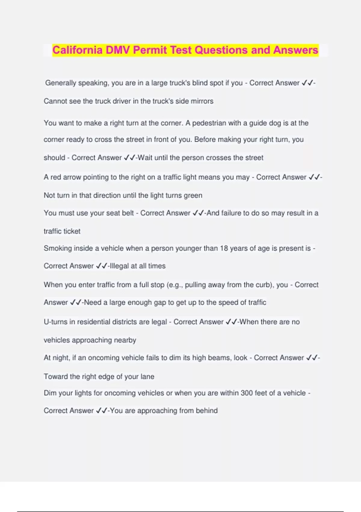 California DMV Permit Test Questions and Answers Generally speaking, you are in a large truck's blind spot if you - Correct Answer ️️ - Cannot see the truck driver in the truck's side mirrors You want to make a right turn at the corner. A pedestrian with a guide dog is at the corner ready to cross the street in front of you. Before making your right turn, you should - Correct Answer ️️ -Wait until the person crosses the street A red arrow pointing to the right on a traffic light means you may - Correct Answer ️️ - Not turn in that direction until the light turns green You must use your seat belt - Correct Answer ️️ -And failure to do so may result in a traffic ticket Smoking inside a vehicle when a person younger than 18 years of age is present is - Correct Answer ️️ -Illegal at all times When you enter traffic from a full stop (e.g., pulling away from the curb), you - Correct Answer ️️ -Need a large enough gap to get up to the speed of traffic U-turns in residential districts are legal - Correct Answer ️️ -When there are no vehicles approaching nearby At night, if an oncoming vehicle fails to dim its high beams, look - Correct Answer ️️ - Toward the right edge of your lane Dim your lights for oncoming vehicles or when you are within 300 feet of a vehicle - Correct Answer ️️ -You are approaching from behind The "three-second-rule" applied to the space ____ of your vehicle - Correct Answer ️️ - Ahead Two sets of solid double yellow lines spaced two feet or more apart - Correct Answer ️️ -Should be treated like a solid wall and not be crossed You are at a red traffic signal. The traffic light turns green, but there are still other vehicles in the intersection. You should - Correct Answer ️️ -Wait until the vehicles clear the intersection before entering Always look carefully for motorcycles before you change lanes because - Correct Answer ️️ -Their smaller size makes them harder to see If you are a minor and your cell phone rings while you are driving, you should - Correct Answer ️️ -Let the call go to voice mail Is it illegal for a person under 21 years of age to drive with a blood alcohol concentration (BAC) that is ___ or more - Correct Answer ️️ -0.01%-One hundredth of one percent If you see orange construction signs and cones on a freeway, you must - Correct Answer ️️ -Be prepared for workers and equipment ahead You must notify DMV within 5 days if you - Correct Answer ️️ -Sell or transfer your vehicle A peace officer stops you because he suspects you are DUI. You refuse to take a chemical test. What happens now? - Correct Answer ️️ -Your driving privilege may be taken away Before driving into an intersection from a stop, you should look - Correct Answer ️️ - Left, right, and left again You should always turn on your emergency flashers when - Correct