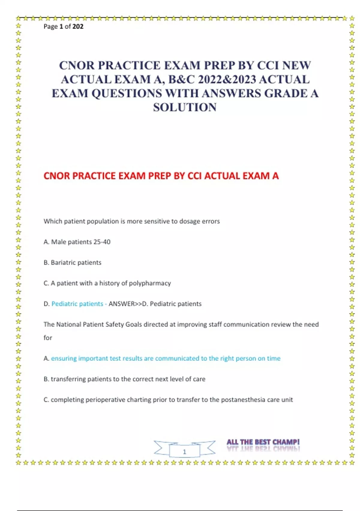 CNOR PRACTICE EXAM PREP BY CCI NEW ACTUAL EXAM A, B&C 2022&2023 ACTUAL EXAM QUESTIONS WITH ANSWERS GRADE A SOLUTION.