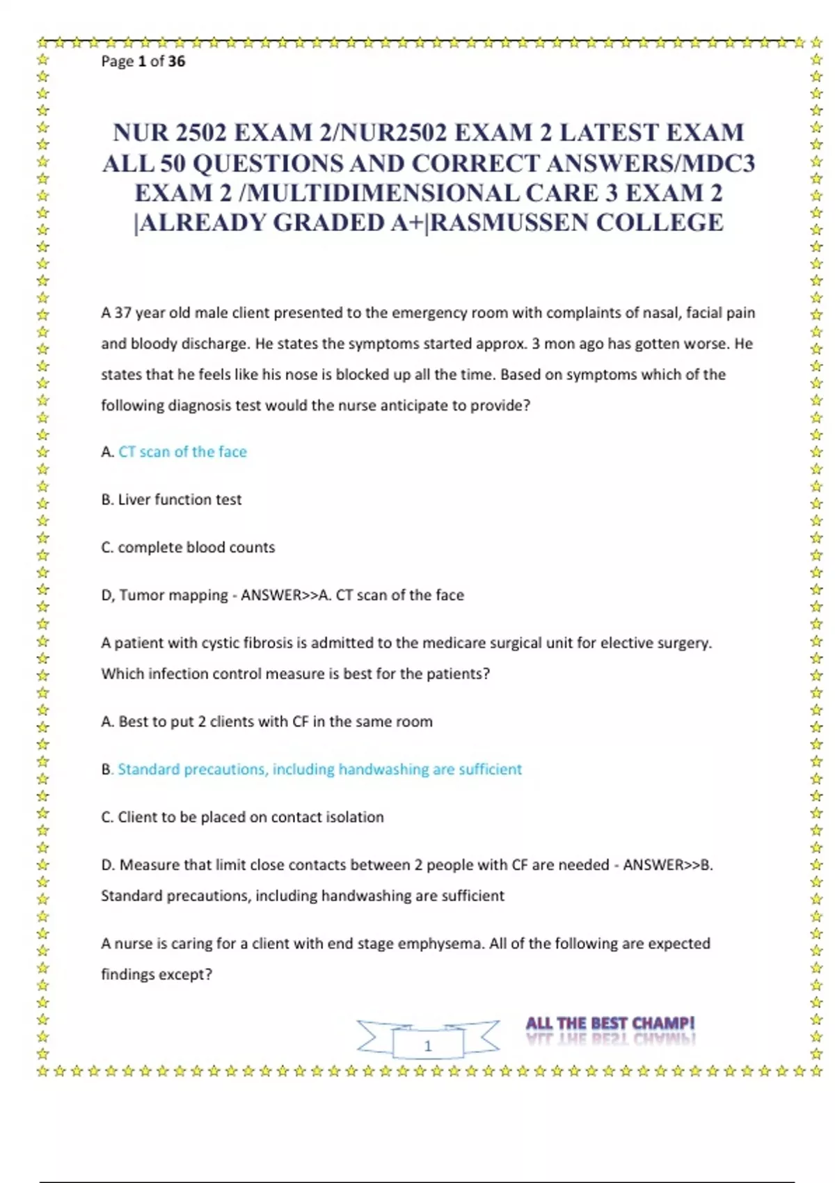 NUR 2502 EXAM 2/NUR2502 EXAM 2 LATEST EXAM ALL 50 QUESTIONS AND CORRECT ANSWERS/MDC3 EXAM 2 /MULTIDIMENSIONAL CARE 3 EXAM 2 |ALREADY GRADED A+|RASMUSSEN COLLEGE COMPLETE