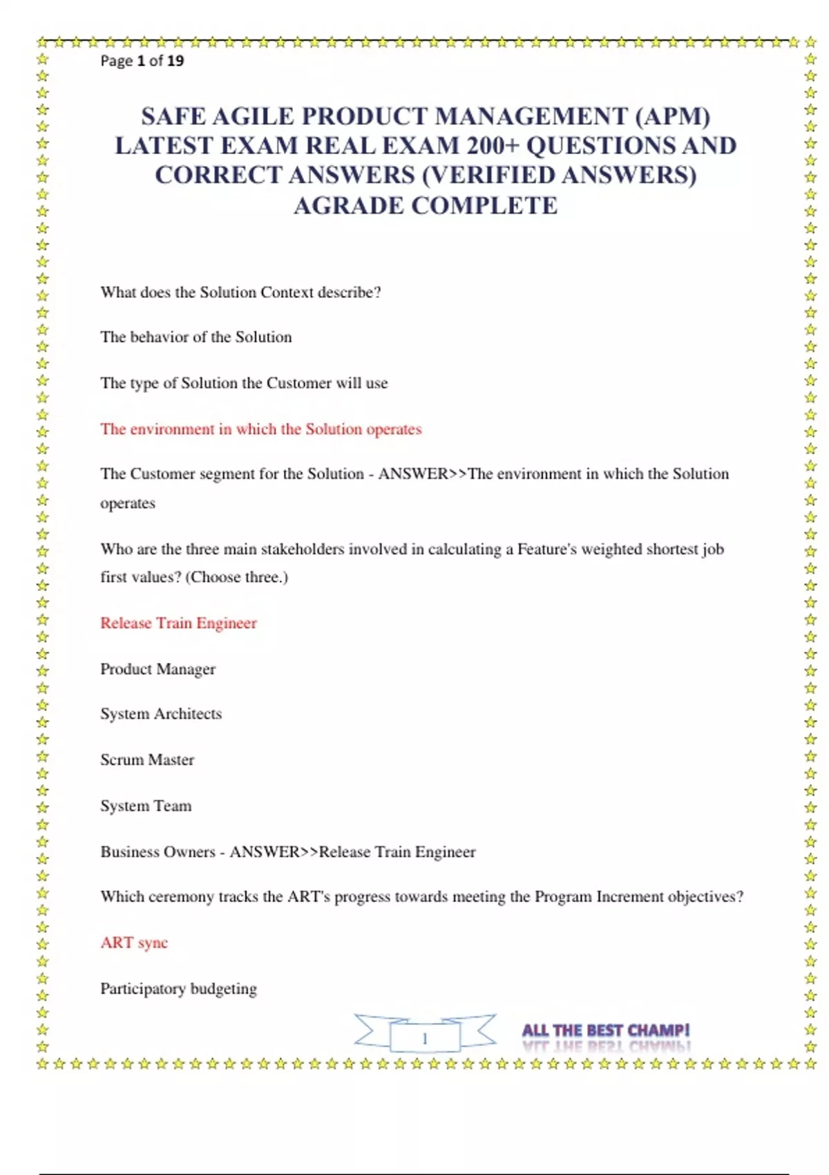 SAFE AGILE PRODUCT MANAGEMENT (APM) LATEST EXAM REAL EXAM 200+ QUESTIONS AND CORRECT ANSWERS (VERIFIED ANSWERS) AGRADE COMPLETE