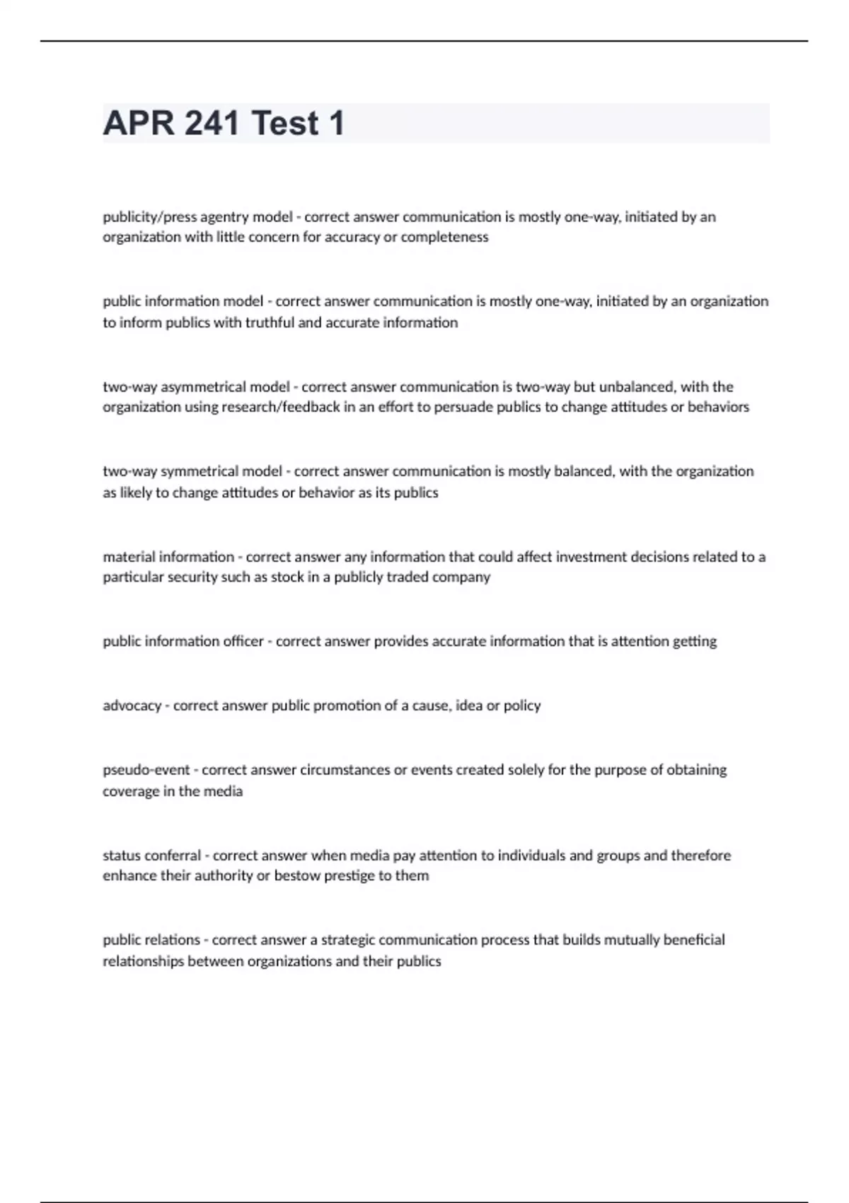 APR 241 Liberty University -APR 241 Test 1 well answered rated A+publicity/press agentry model - correct answer communication is mostly one-way, initiated by an organization with little concern for accuracy or completeness public information model - correct answer communication is mostly one-way, initiated by an organization to inform publics with truthful and accurate information two-way asymmetrical model - correct answer communication is two-way but unbalanced, with the organization using research/feedback in an effort to persuade publics to change attitudes or behaviors two-way symmetrical model - correct answer communication is mostly balanced, with the organization as likely to change attitudes or behavior as its publics material information - correct answer any information that could affect investment decisions related to a particular security such as stock in a publicly traded company public information officer - correct answer provides accurate information that is attention getting advocacy - correct answer public promotion of a cause, idea or policy pseudo-event - correct answer circumstances or events created solely for the purpose of obtaining coverage in the media status conferral - correct answer when media pay attention to individuals and groups and therefore enhance their authority or bestow prestige to them