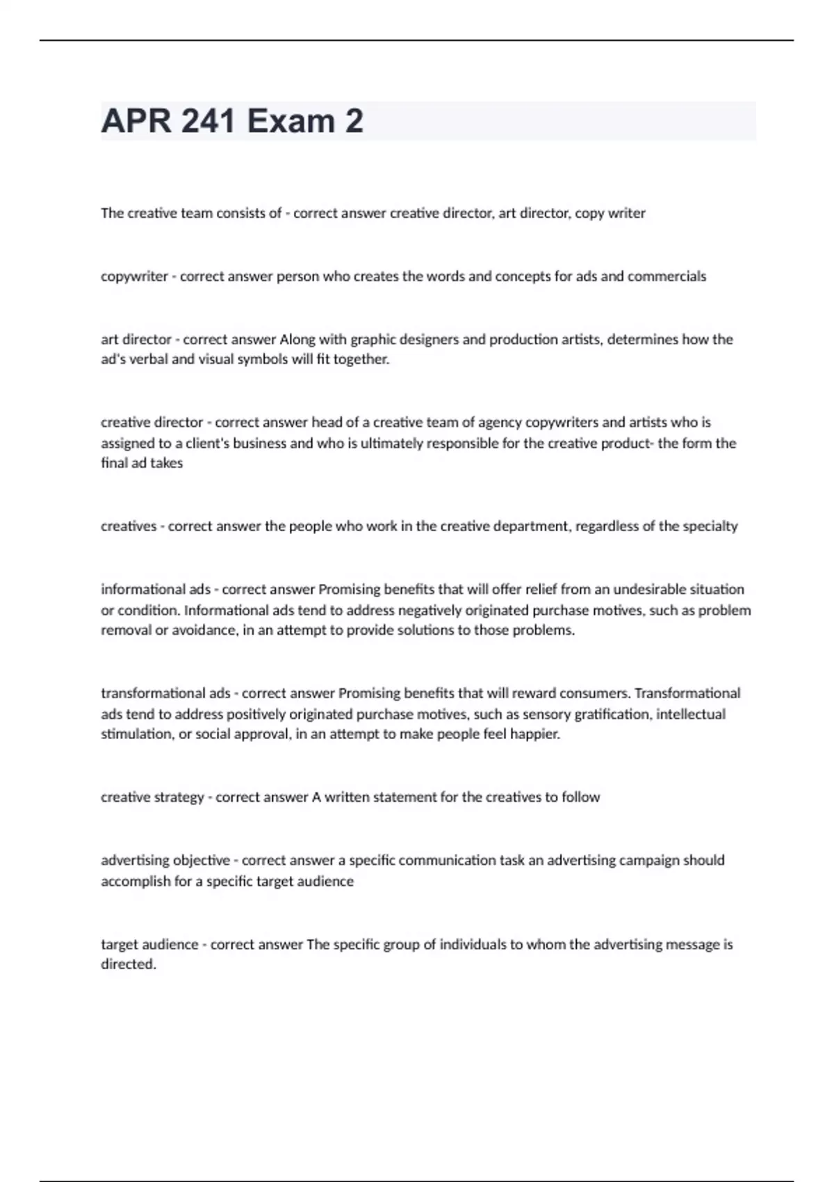 APR 241 Exam 2The creative team consists of - correct answer creative director, art director, copy writer copywriter - correct answer person who creates the words and concepts for ads and commercials art director - correct answer Along with graphic designers and production artists, determines how the ad's verbal and visual symbols will fit together. creative director - correct answer head of a creative team of agency copywriters and artists who is assigned to a client's business and who is ultimately responsible for the creative product- the form the final ad takes creatives - correct answer the people who work in the creative department, regardless of the specialty informational ads - correct answer Promising benefits that will offer relief from an undesirable situation or condition. Informational ads tend to address negatively originated purchase motives, such as problem removal or avoidance, in an attempt to provide solutions to those problems. transformational ads - correct answer Promising benefits that will reward consumers. Transformational ads tend to address positively originated purchase motives, such as sensory gratification, intellectual stimulation, or social approval, in an attempt to make people feel happier. creative strategy - correct answer A written statement for the creatives to follow advertising objective - correct answer a specific communication task an advertising campaign should accomplish for a specific target audience target audience - correct answer The specific group of individuals to whom the advertising message is directed.