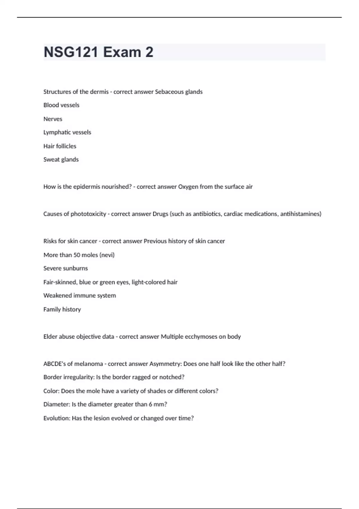 NSG 121 Herzing University -NSG121 Exam 2 fully solved rated A+Structures of the dermis - correct answer Sebaceous glands Blood vessels Nerves Lymphatic vessels Hair follicles Sweat glands How is the epidermis nourished? - correct answer Oxygen from the surface air Causes of phototoxicity - correct answer Drugs (such as antibiotics, cardiac medications, antihistamines) Risks for skin cancer - correct answer Previous history of skin cancer More than 50 moles (nevi) Severe sunburns Fair-skinned, blue or green eyes, light-colored hair Weakened immune system Family history Elder abuse objective data - correct answer Multiple ecchymoses on body ABCDE's of melanoma - correct answer Asymmetry: Does one half look like the other half? Border irregularity: Is the border ragged or notched? Color: Does the mole have a variety of shades or different colors? Diameter: Is the diameter greater than 6 mm? Evolution: Has the lesion evolved or changed over time?