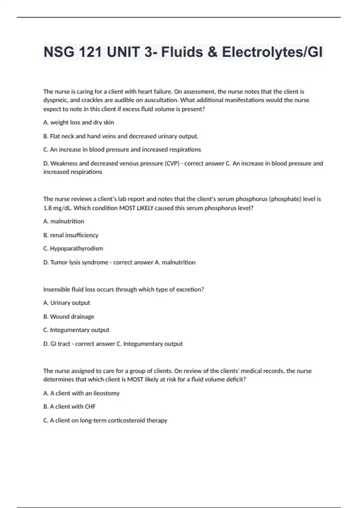 NSG 121 UNIT 3- Fluids & Electrolytes/GIThe nurse is caring for a client with heart failure. On assessment, the nurse notes that the client is dyspneic, and crackles are audible on auscultation. What additional manifestations would the nurse expect to note in this client if excess fluid volume is present? A. weight loss and dry skin B. Flat neck and hand veins and decreased urinary output. C. An increase in blood pressure and increased respirations D. Weakness and decreased venous pressure (CVP) - correct answer C. An increase in blood pressure and increased respirations The nurse reviews a client's lab report and notes that the client's serum phosphorus (phosphate) level is 1.8 mg/dL. Which condition MOST LIKELY caused this serum phosphorus level? A. malnutrition B. renal insufficiency C. Hypoparathyrodism D. Tumor lysis syndrome - correct answer A. malnutrition Insensible fluid loss occurs through which type of excretion? A. Urinary output B. Wound drainage C. Integumentary output D. GI tract - correct answer C. Integumentary output The nurse assigned to care for a group of clients. On review of the clients' medical records, the nurse determines that which client is MOST likely at risk for a fluid volume deficit? A. A client with an ileostomy B. A client with CHF C. A client on long-term corticosteroid therapy