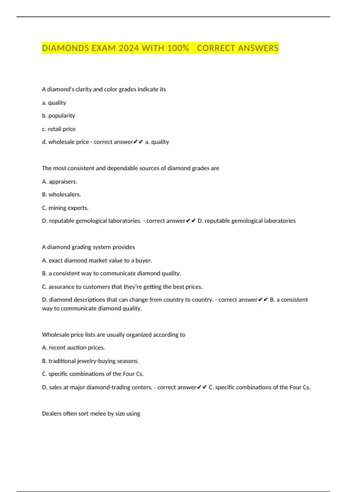 DIAMONDS EXAM 2024 WITH 100% CORRECT ANSWERS A diamond's clarity and color grades indicate its a. quality b. popularity c. retail price d. wholesale price - correct answer a. quality The most consistent and dependable sources of diamond grades are A. appraisers. B. wholesalers. C. mining experts. D. reputable gemological laboratories. - correct answer D. reputable gemological laboratories A diamond grading system provides A. exact diamond market value to a buyer. B. a consistent way to communicate diamond quality. C. assurance to customers that they're getting the best prices. D. diamond descriptions that can change from country to country. - correct answer B. a consistent way to communicate diamond quality. Whole