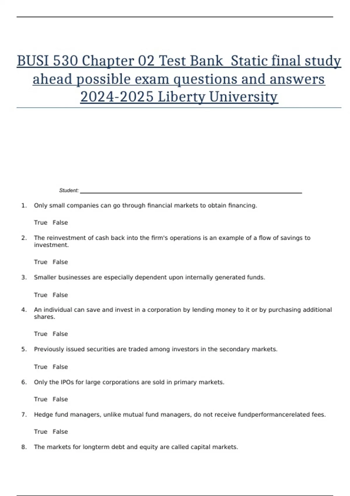 BUSI 530 Chapter 02 Test Bank Static final study ahead possible exam questions and answers Liberty University