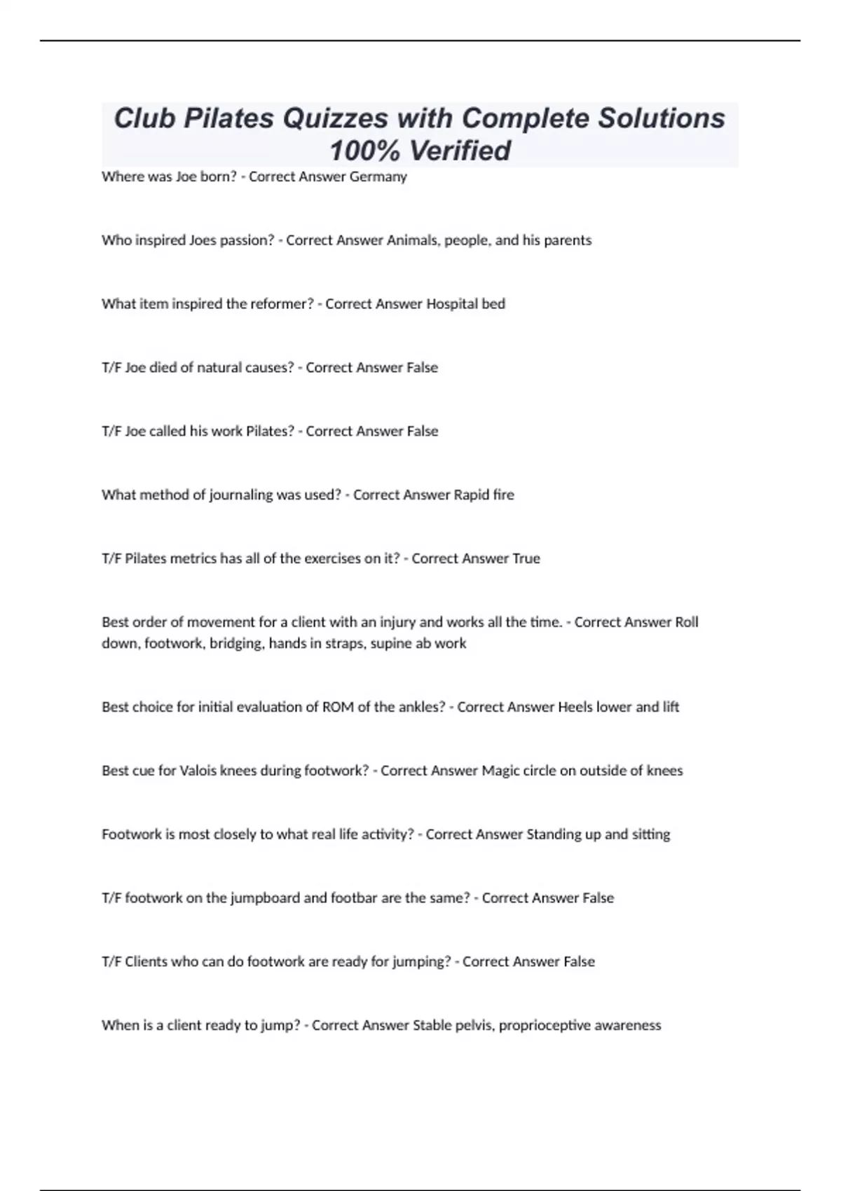 Club Pilates Quizzes with Complete Solutions 100% Verified