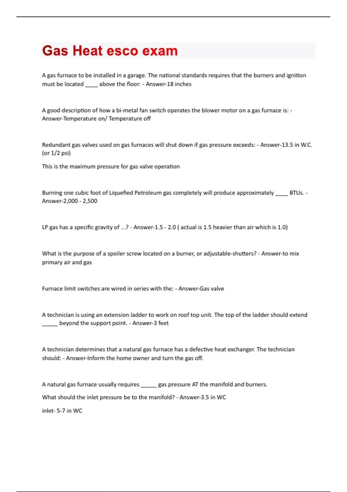 A gas furnace to be installed in a garage. The national standards requires that the burners and ignition must be located ____ above the floor: - Answer-18 inches A good description of how a bi-metal fan switch operates the blower motor on a gas furnace is: - Answer-Temperature on/ Temperature off Redundant gas valves used on gas furnaces will shut down if gas pressure exceeds: - Answer-13.5 in W.C. (or 1/2 psi) This is the maximum pressure for gas valve operation Burning one cubic foot of Liquefied Petroleum gas completely will produce approximately ____ BTUs. - Answer-2,000 - 2,500 LP gas has a specific gravity of ...? - Answer-1.5 - 2.0 ( actual is 1.5 heavier than air which is 1.0) What is the purpose of a spoiler screw located on a burner, or adjustable-shutters? - Answer-to mix primary air and gas Furnace limit switches are wired in series with the: - Answer-Gas valve A technician is using an extension ladder to work on roof top unit. The top of the ladder should extend _____ beyond the support point. - Answer-3 feet A technician determines that a natural gas furnace has a defective heat exchanger. The technician should: - Answer-Inform the home owner and turn the gas off. A natural gas furnace usually requires _____ gas pressure AT the manifold and burners. What should the inlet pressure be to the manifold? - Answer-3.5 in WC inlet- 5-7 in WCThe vent system for a condensing furnace is classified as ___ by the National Field Gas Code. - AnswerCategory IV (4) Type B vent pipe must be kept at least ____ from combustible materials. - Answer-one inch Typical condensing furnaces have an AFUE rating of at least: - Answer-90% You have installed a Category IV two-pipe vent system that terminates through the roof of the residence. The elbow for the combustion air intake, above the roof, should...? - Answer-Point down The reason heating thermostats have anticipators is to: - Answer-reduce overshoot The typical fluw gas temperature of a Category III furnace is: - Answer-280 F - 300 F The proper chemical name for natural gas is: - Answer-Methane Burning one cubic foot of natural gas will produce approximately ___ BTU's. - Answer-900-1100 A furnace nameplate specifies a temperature rise of 40 to 70 degrees. Temperature measurements indicate a rise of 80 degrees. The most appropriate action is to: - Answer-increase fan speed A BTU is the amount of heat required to raise the temperature of one pound of water: - Answer-one degree Fahrenheit Natural gas piping must be sized to prevent excessive pressure drops. The National Fuel Gas Code maximum pressure drop allowance is approximately: - Answer-0.35 in WC Gas piping must be installed with a pitch of: - Answer-1/4" per 15' runPipe joint compound should be applied to: - Answer-male threads less two end threads A technician is installing a copper elbow on LP gas line; what should be used? - Answer-15% silver solder To burn one cubic foot of Natural Gas completely, AT LEAST ____ of combustion air must be available. - Answer-10 cu ft. The ignition temperature of Natural Gas is ____ - Answer-1100 F - 1200 F