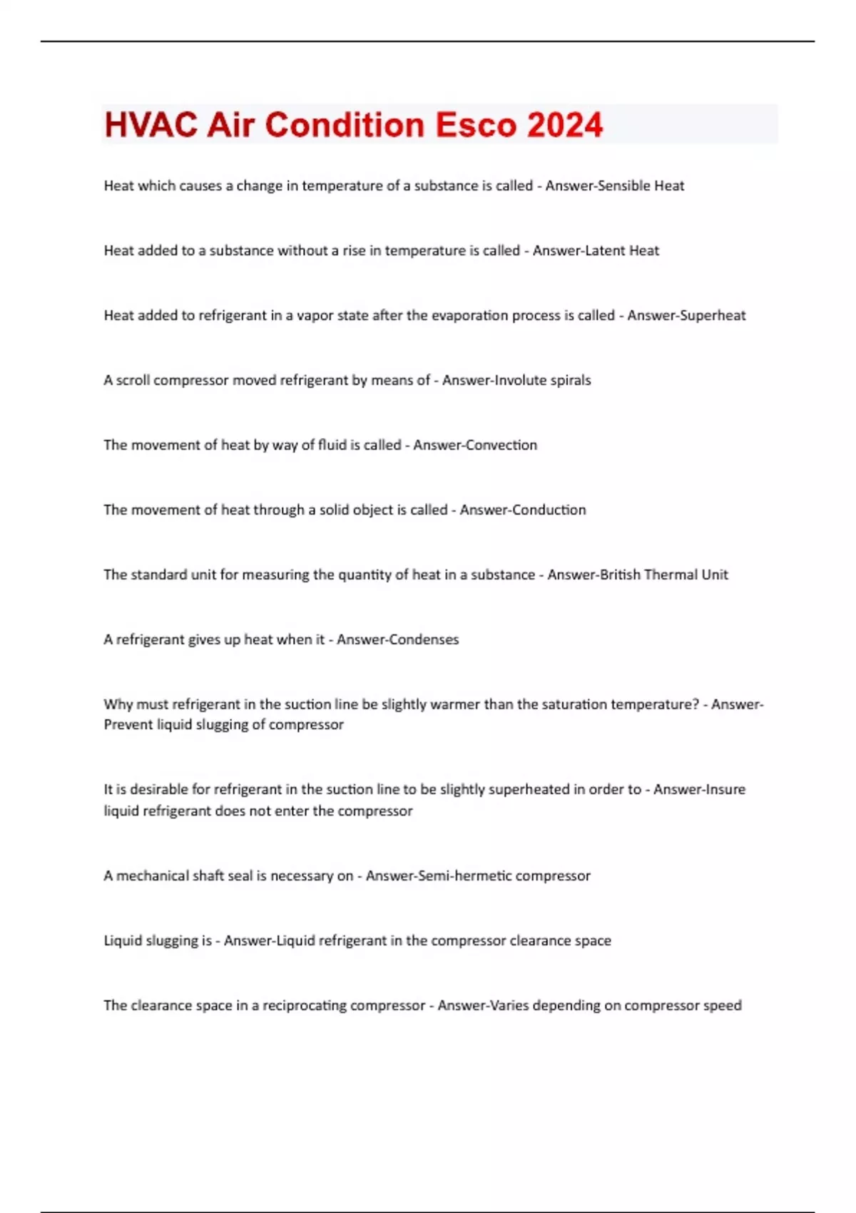 Heat which causes a change in temperature of a substance is called - Answer-Sensible Heat Heat added to a substance without a rise in temperature is called - Answer-Latent Heat Heat added to refrigerant in a vapor state after the evaporation process is called - Answer-Superheat A scroll compressor moved refrigerant by means of - Answer-Involute spirals The movement of heat by way of fluid is called - Answer-Convection The movement of heat through a solid object is called - Answer-Conduction The standard unit for measuring the quantity of heat in a substance - Answer-British Thermal Unit A refrigerant gives up heat when it - Answer-Condenses Why must refrigerant in the suction line be slightly warmer than the saturation temperature? - AnswerPrevent liquid slugging of compressor It is desirable for refrigerant in the suction line to be slightly superheated in order to - Answer-Insure liquid refrigerant does not enter the compressor A mechanical shaft seal is necessary on - Answer-Semi-hermetic compressor Liquid slugging is - Answer-Liquid refrigerant in the compressor clearance space The clearance space in a reciprocating compressor - Answer-Varies depending on compressor speedWhich of the following types of air conditioning compressors is most energy efficient - AnswerCentrifugal Which of the following represent the right order for the functions of a condenser? - Answer-Desuperheat, condenses, sub-cools Refrigerant R-134a vapor enters the compressor at 124 psig, 100°f. It leaves as a liquid from the condenser sub-cooled 20°f, and the pressure will approximately - Answer-18.4 psig There are 3 basic types of condensers, the air cooled, the water cooled, and the _______ cooled - Answer-Evaporative 10 lbs. of refrigerant passing through a water cooled condenser will lose 20 BTU's of heat per lb. If 10 lbs. of water passes through the condenser with an entering temperature of 80°f. The temperature of the water leaving the condenser is - Answer-100°f The heat removed from the refrigerant by the condenser is - Answer-Both sensible and latent heat An energy recovery ventilator is - Answer-An air to air heat exchanger to recover heat Which of the following can NOT be used as a low ambient temperature control? - Answer-Crankcase regulating valves The state of refrigeration in the suction line should be - Answer-Low pressure/ low temperature vapor The state of refrigerant entering the condenser is - Answer-High pressure/ highly superheated vapor The evaporator - Answer-Transfers heat from the refrigerated space to the refrigerant Which of the following is not a thermodynamic property of refrigerant - Answer-FlammabilityThe sequential order of steps in the vapor-compression process are - Answer-Compression, condensation, expansion, vaporization If a 30 pound container of R-410A refrigerant has been stored over night at 70°F, the pressure in the cylinder should be approximately - Answer-201 psig
