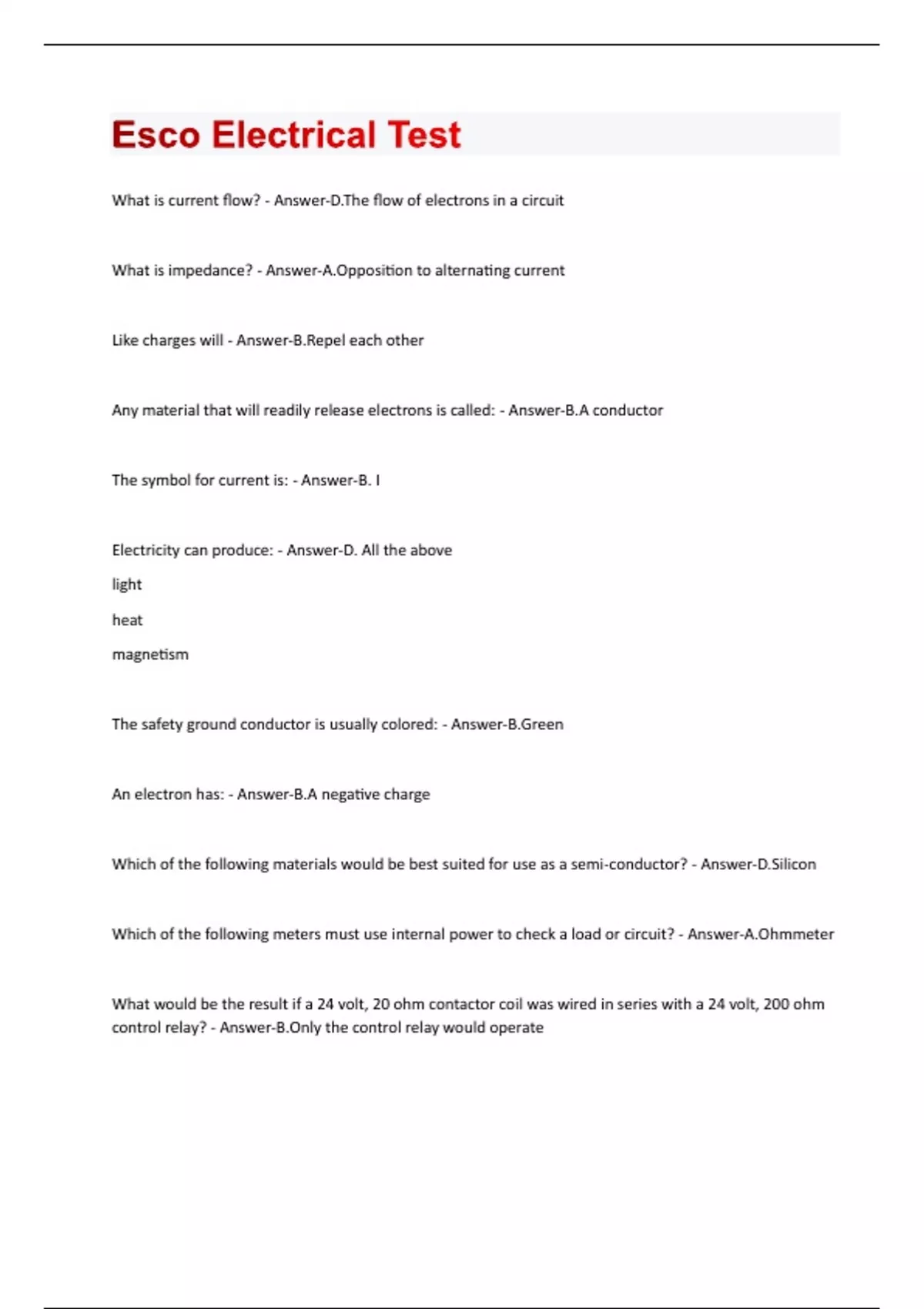 Esco Electrical Test Questions And Answers | 100% Correct Answers |Updated Quiz