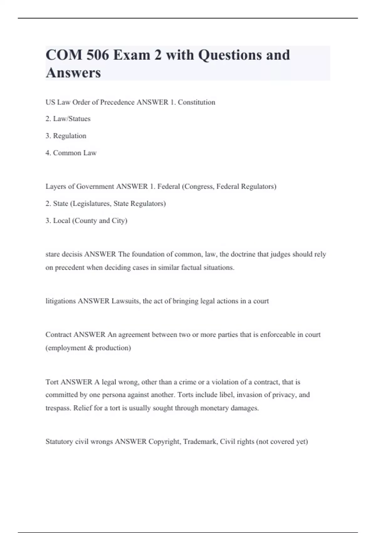 COM 506 Exam 2 with Questions and Answers US Law Order of Precedence ANSWER 1. Constitution 2. Law/Statues 3. Regulation 4. Common Law Layers of Government ANSWER 1. Federal (Congress, Federal Regulators) 2. State (Legislatures, State Regulators) 3. Local (County and City) stare decisis ANSWER The foundation of common, law, the doctrine that judges should rely on precedent when deciding cases in similar factual situations. litigations ANSWER Lawsuits, the act of bringing legal actions in a court Contract ANSWER An agreement between two or more parties that is enforceable in court (employment & production) Tort ANSWER A legal wrong, other than a crime or a violation of a contract, that is committed by one persona against another. Torts include libel, invasion of privacy, and trespass. Relief for a tort is usually sought through monetary damages. Statutory civil wrongs ANSWER Copyright, Trademark, Civil rights (not covered yet)