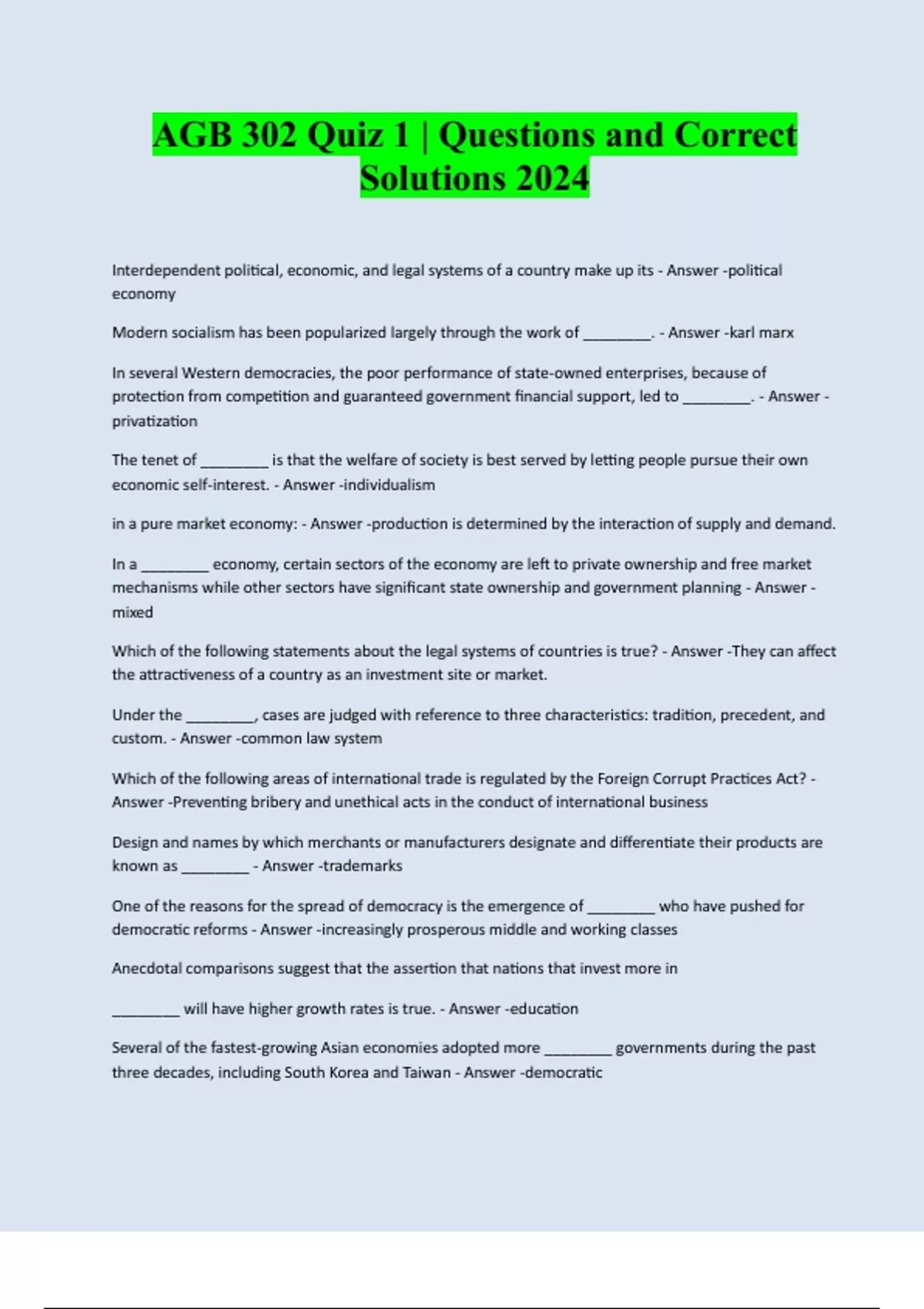 AGB 302 Quiz 1 | Questions and Correct Solutions 2024 Interdependent political, economic, and legal systems of a country make up its - Answer -political economy Modern socialism has been popularized largely through the work of ________. - Answer -karl marx In several Western democracies, the poor performance of state-owned enterprises, because of protection from competition and guaranteed government financial support, led to ________. - Answer - privatization The tenet of ________ is that the welfare of society is best served by letting people pursue their own economic self-interest. - Answer -individualism in a pure market economy: - Answer -production is determined by the interaction of supply and demand. In a ________ economy, certain sectors of the economy are left to private ownership and free market mechanisms while other sectors have significant state ownership and government planning - Answer - mixed