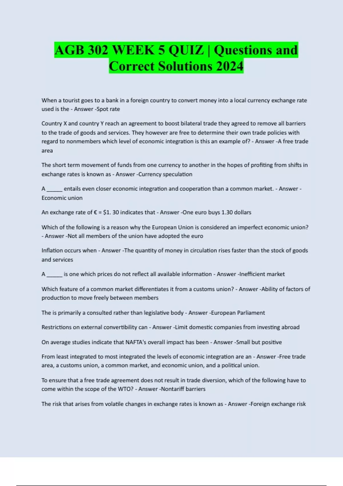 AGB 302 WEEK 5 QUIZ | Questions and Correct Solutions 2024 When a tourist goes to a bank in a foreign country to convert money into a local currency exchange rate used is the - Answer -Spot rate Country X and country Y reach an agreement to boost bilateral trade they agreed to remove all barriers to the trade of goods and services. They however are free to determine their own trade policies with regard to nonmembers which level of economic integration is this an example of? - Answer -A free trade area The short term movement of funds from one currency to another in the hopes of profiting from shifts in exchange rates is known as - Answer -Currency speculation A _____ entails even closer economic integration and cooperation than a common market. - Answer - Economic union An exchange rate of € = $1. 30 indicates that - Answer -One euro buys 1.30 dollars Which of the following is a reason why the European Union is considered an imperfect economic union? - Answer -Not all members of the union have adopted the euro