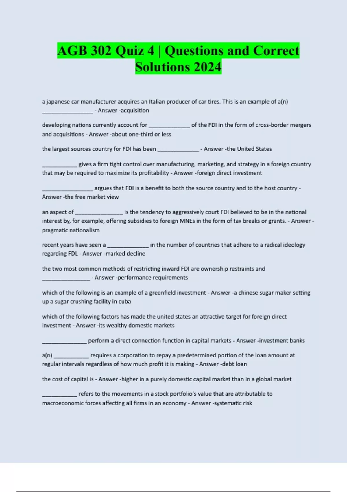 AGB 302 Quiz 4 | Questions and Correct Solutions 2024 a japanese car manufacturer acquires an Italian producer of car tires. This is an example of a(n) ________________ - Answer -acquisition developing nations currently account for _____________ of the FDI in the form of cross-border mergers and acquisitions - Answer -about one-third or less the largest sources country for FDI has been _____________ - Answer -the United States ___________ gives a firm tight control over manufacturing, marketing, and strategy in a foreign country that may be required to maximize its profitability - Answer -foreign direct investment ________________ argues that FDI is a benefit to both the source country and to the host country - Answer -the free market view an aspect of _______________ is the tendency to aggressively court FDI believed to be in the national interest by, for example, offering subsidies to foreign MNEs in the form of tax breaks or grants. - Answer - pragmatic nationalism recent years have seen a _____________ in the number of countries that adhere to a radical ideo