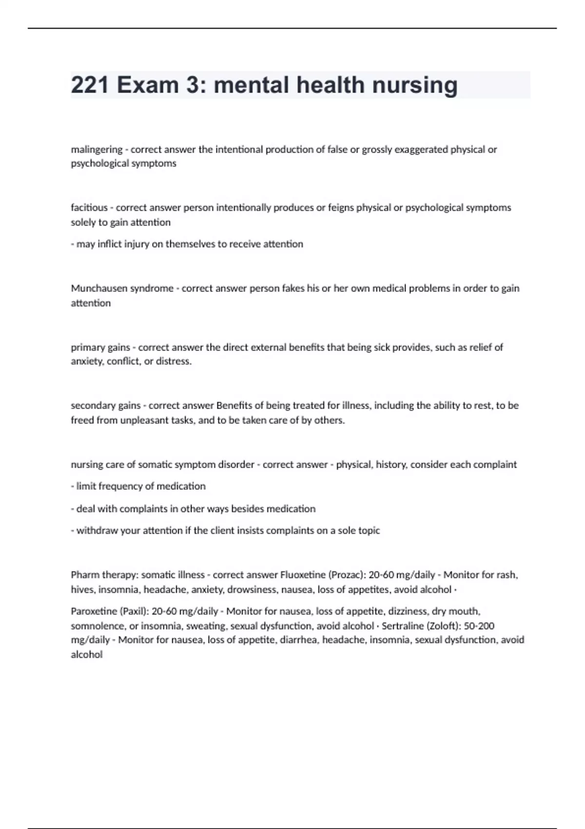 221 Exam 3: mental health nursingmalingering - correct answer the intentional production of false or grossly exaggerated physical or psychological symptoms facitious - correct answer person intentionally produces or feigns physical or psychological symptoms solely to gain attention - may inflict injury on themselves to receive attention Munchausen syndrome - correct answer person fakes his or her own medical problems in order to gain attention primary gains - correct answer the direct external benefits that being sick provides, such as relief of anxiety, conflict, or distress. secondary gains - correct answer Benefits of being treated for illness, including the ability to rest, to be freed from unpleasant tasks, and to be taken care of by others. nursing care of somatic symptom disorder - correct answer - physical, history, consider each complaint - limit frequency of medication - deal with complaints in other ways besides medication - withdraw your attention if the client insists complaints on a sole topic Pharm therapy: somatic illness - correct answer Fluoxetine (Prozac): 20-60 mg/daily - Monitor for rash, hives, insomnia, headache, anxiety, drowsiness, nausea, loss of appetites, avoid alcohol · Paroxetine (Paxil): 20-60 mg/daily - Monitor for nausea, loss of appetite, dizziness, dry mouth, somnolence, or insomnia, sweating, sexual dysfunction, avoid alcohol · Sertraline (Zoloft): 50-200 mg/daily - Monitor for nausea, loss of appetite, diarrhea, headache, insomnia, sexual dysfunction, avoid alcohol